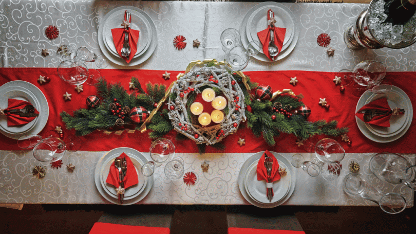 Tavolina e Krishtlindjes - E Vendosur me Mbulesa Tavoline, Pjata dhe Gota - Këshilla