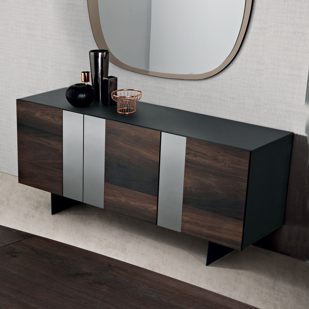 Karroceria me sipërfaqe antraciti dhe melaminë strehon dyer me rimeso lisi , të ndërprera nga futje vertikale qelqi me pasqyrë që e bëjnë kompozimin më të efektshëm vizualisht. Ky kontrast midis drurit të teksturuar dhe reflektimeve të pasqyrës i jep thellësi dhe lëvizje, duke e bërë bufenë elegante dhe dinamike.