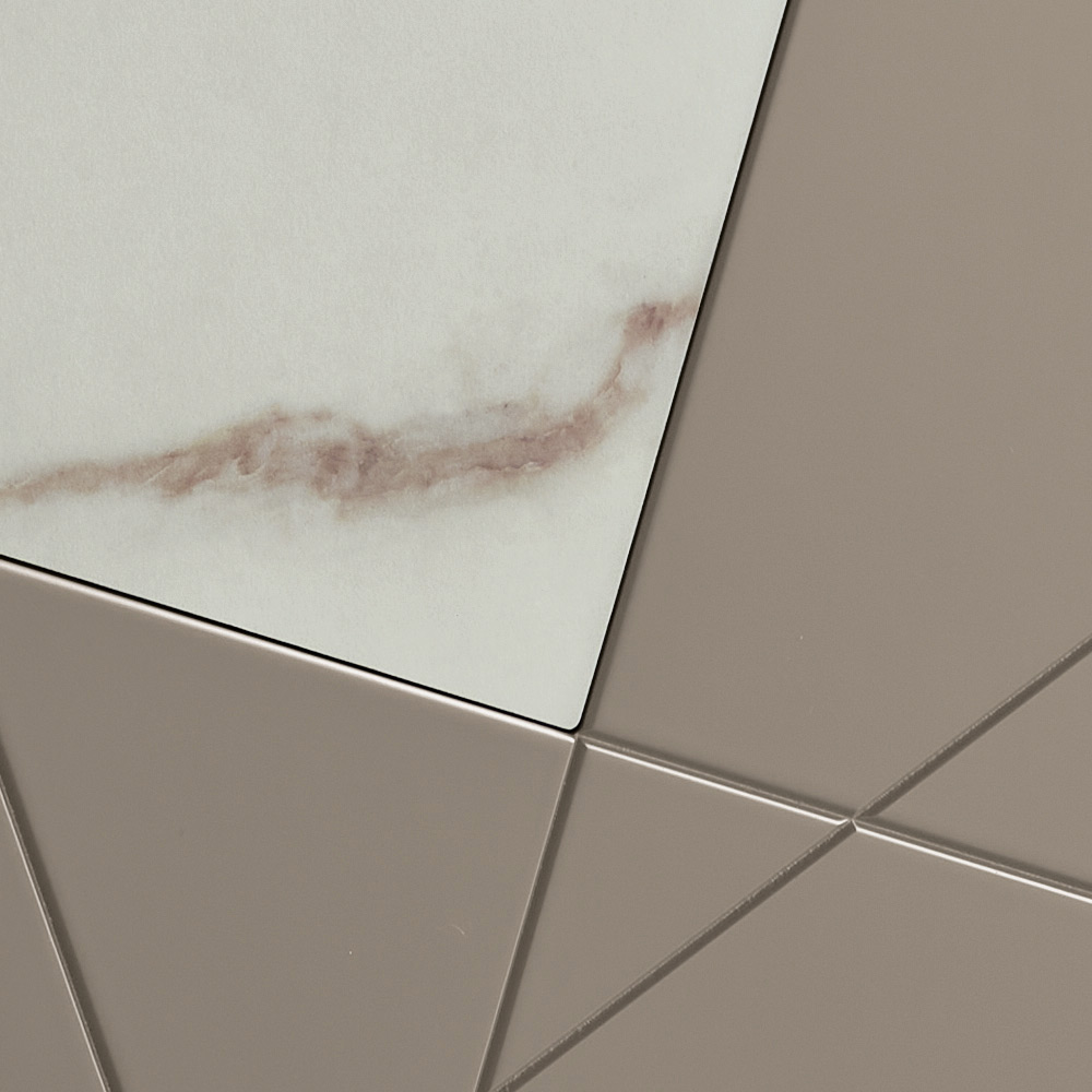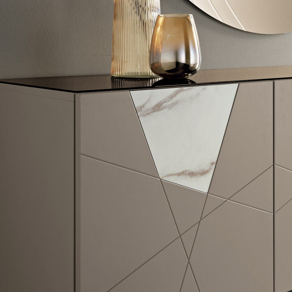 Struktura është bërë nga një guaskë druri me sipërfaqe melamine, një sipërfaqe qelqi të pasqyruar dhe dyer MDF të pantografuara, me gdhendje dekorative që ndërthuren në një dizajn elegant gjeometrik. Shtesat prej qelqi me efekt mermeri pasurojnë sipërfaqen, duke krijuar një ndërthurje të sofistikuar të grafikës dhe materialeve.