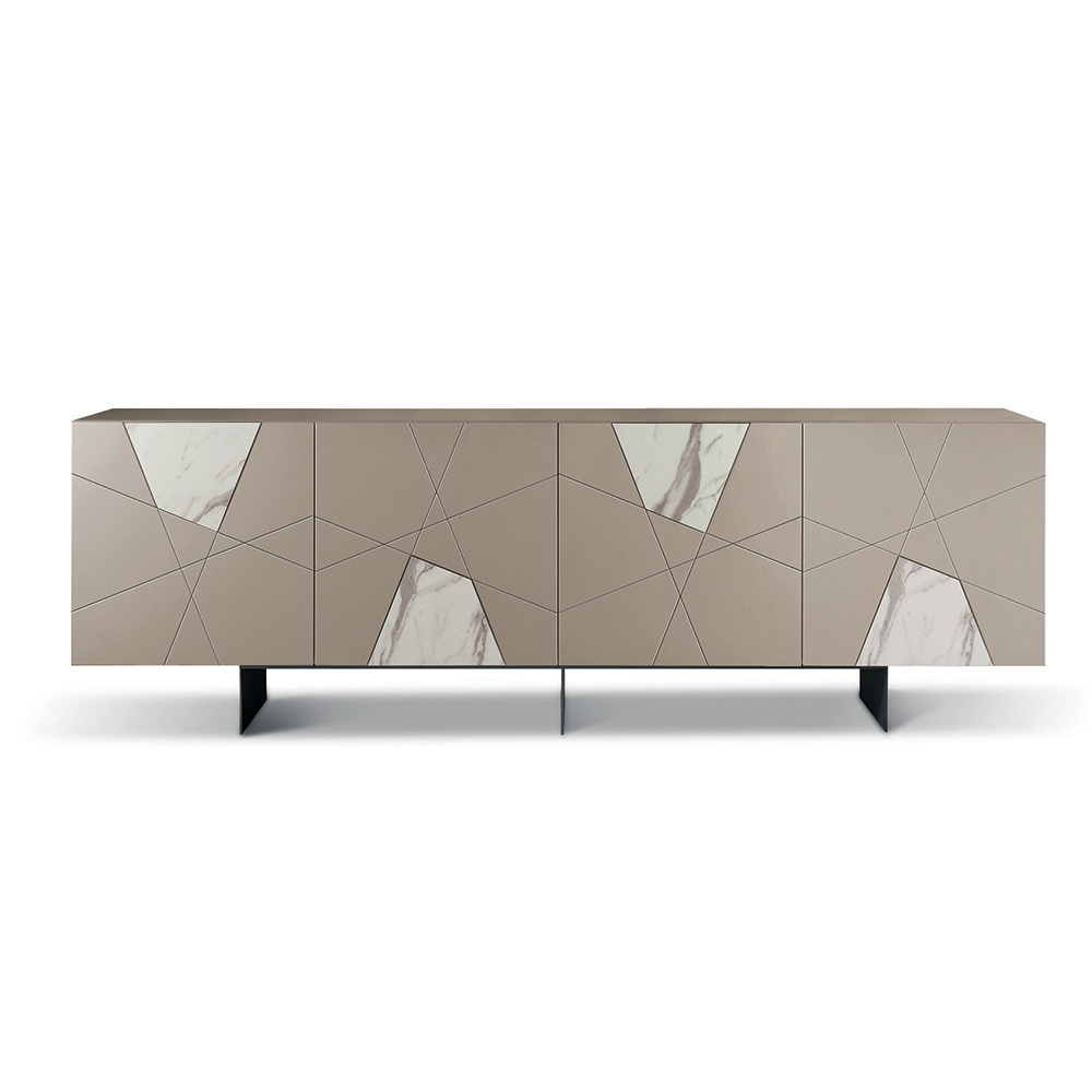 Një bufe elegante, e prodhuar në Itali , ideale për të mobiluar me stil dhomën tuaj të ndenjes ose zonën e ngrënies . Dizajni i saj bashkëkohor kombinon linja gjeometrike dhe materiale kontrastuese, duke krijuar një aksesor mobilimi të rafinuar dhe funksional.