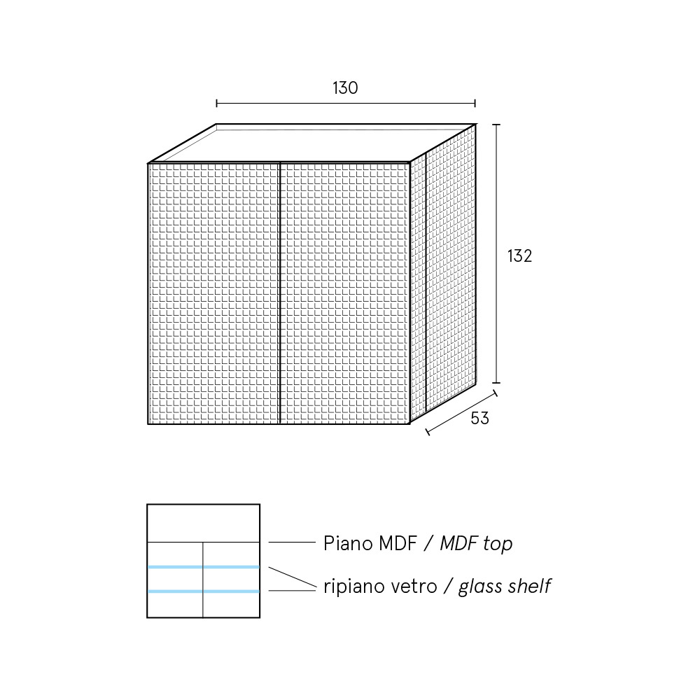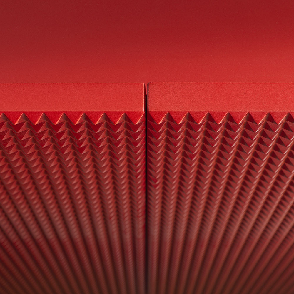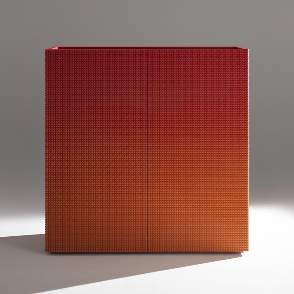 Një pjesë skulpturale që kombinon materialitetin dhe rafinimin , në një ekuilibër të përsosur midis estetikës dhe funksionalitetit . Ky bufe me dy dyer dallohet për përfundimin e tij ikonik portokalli/të kuq "diamant" , një dizajn tre-dimensional vizualisht mbresëlënës, i lëmuar me dorë para llakimit përfundimtar për të arritur një sipërfaqe të gjallë dhe jashtëzakonisht të sofistikuar.