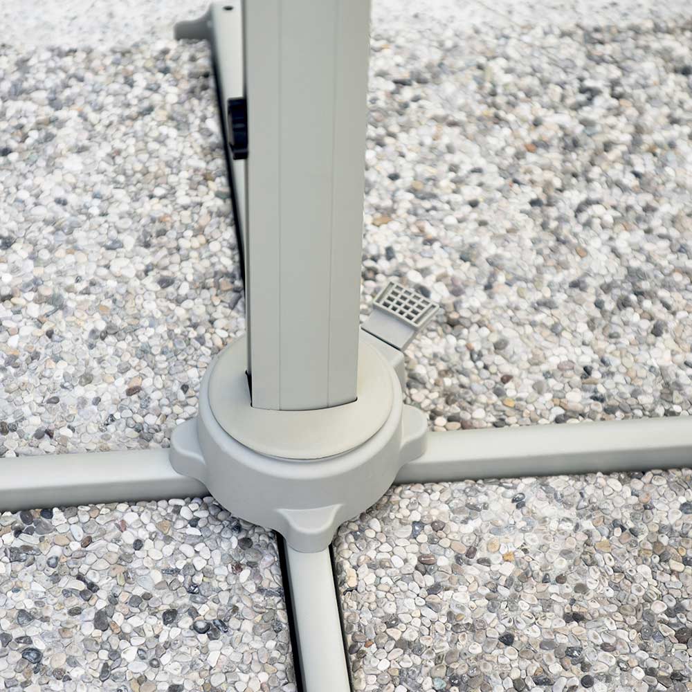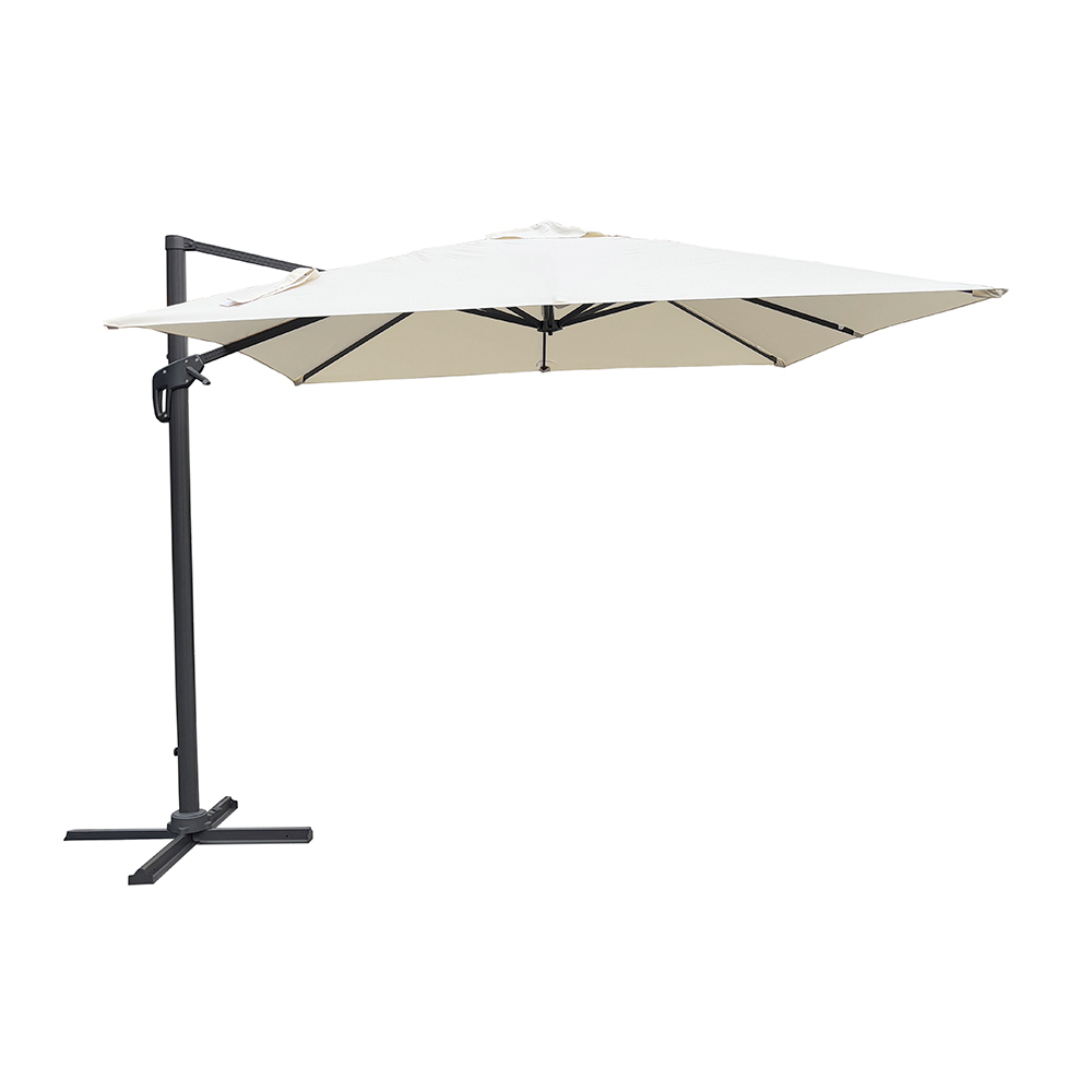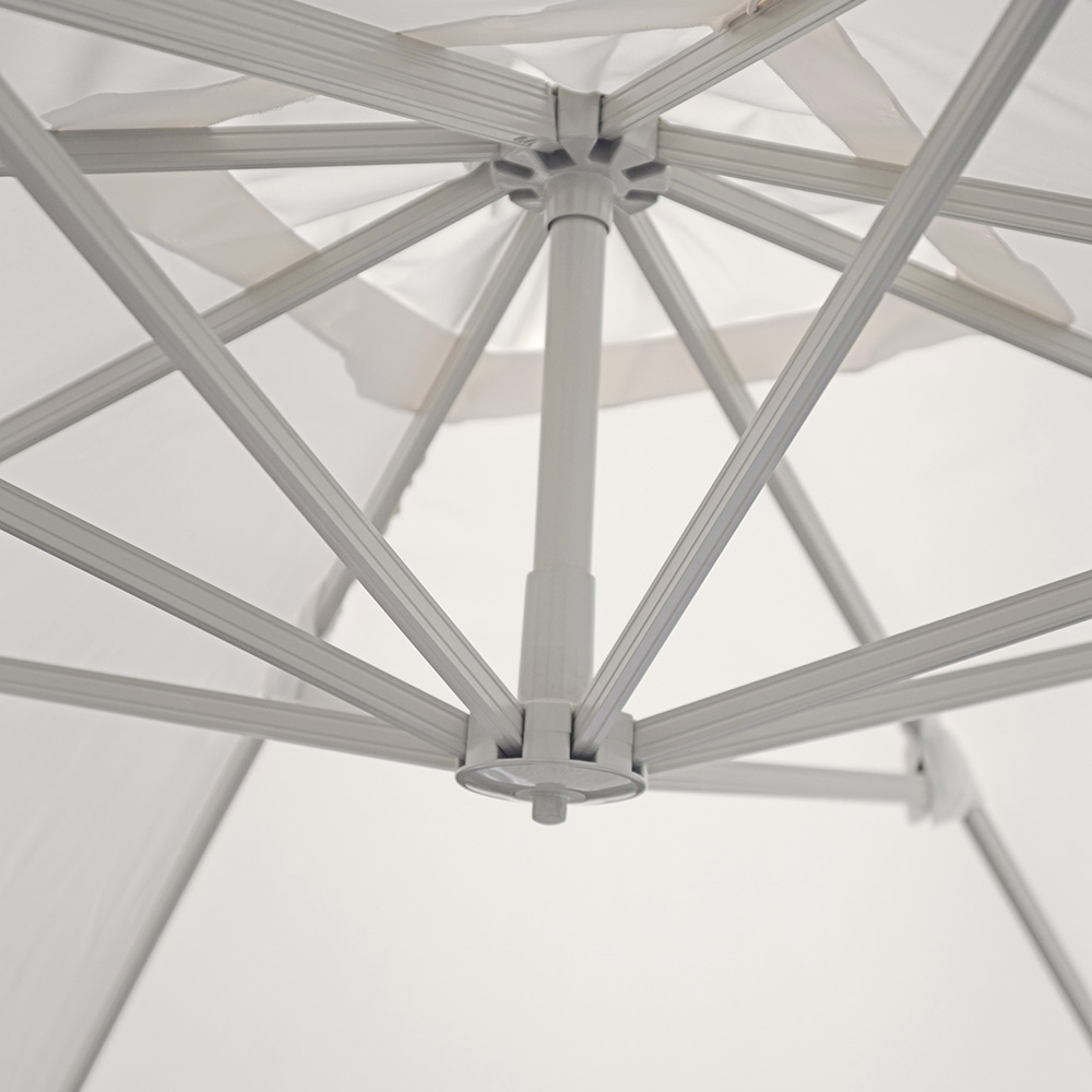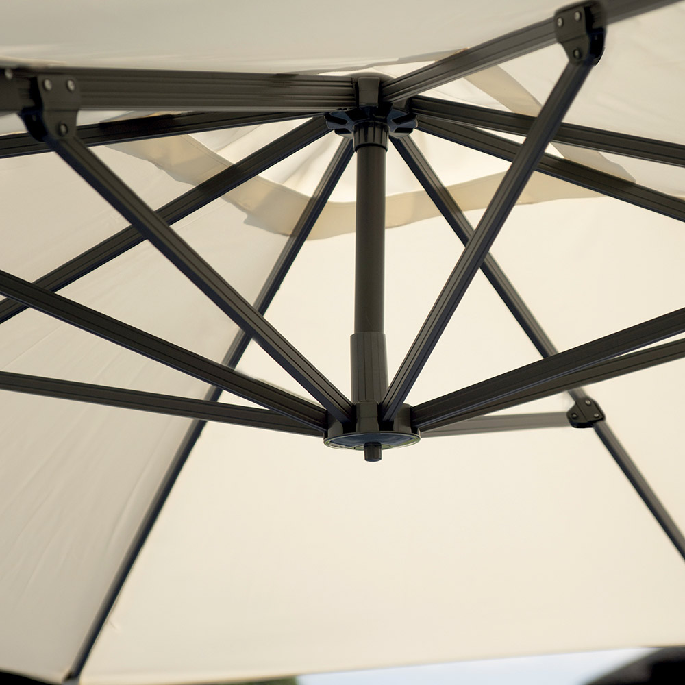 Tenda prej poliesteri ecru 250 g ofron mbrojtje të shkëlqyer nga rrezet e diellit dhe është shumë rezistente ndaj motit, duke krijuar një zonë të bollshme dhe mikpritëse me hije. Falë sistemit të saj të rrotullimit 360° , çadra mund të rregullohet lehtësisht për t'iu përshtatur pozicionit të diellit, duke ofruar gjithmonë mbulim dhe rehati maksimale.