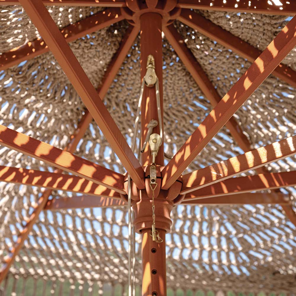 Kjo çadër kombinon stilin natyror dhe sharmin artizanal , duke e bërë atë pjesën qendrore të përsosur për plazhe, pishina ose tarraca në stilin mesdhetar. Shufra prej druri Ø 48/8 mm nxjerr ngrohtësi dhe autenticitet, ndërsa brinjët 17 x 35 mm sigurojnë soliditet dhe stabilitet me kalimin e kohës.