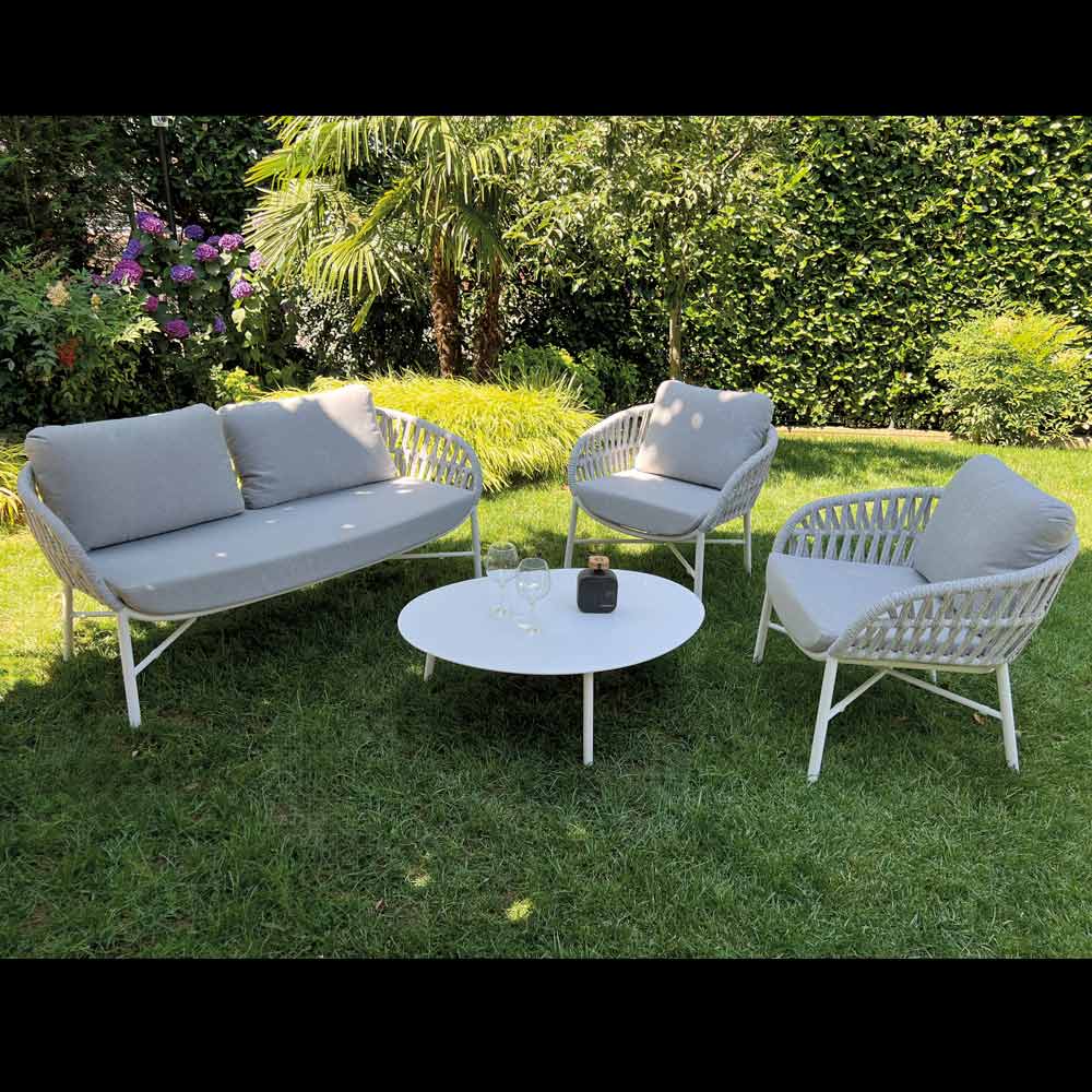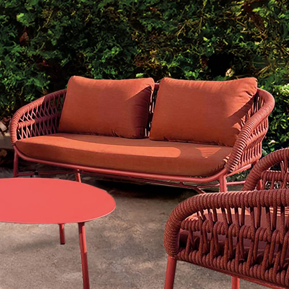 Ky divan kopshti është një shembull i përsosur i dizajnit mikpritës dhe përsosjes artizanale , ideale për krijimin e një këndi sallë pritjeje dedikuar relaksimit dhe stilit . Struktura e lyer e aluminit , e lehtë por rezistente, mbështet në mënyrë elegante një thurje të rafinuar në litar poliesteri , i cili i jep lëvizje dhe personalitet sediljes.