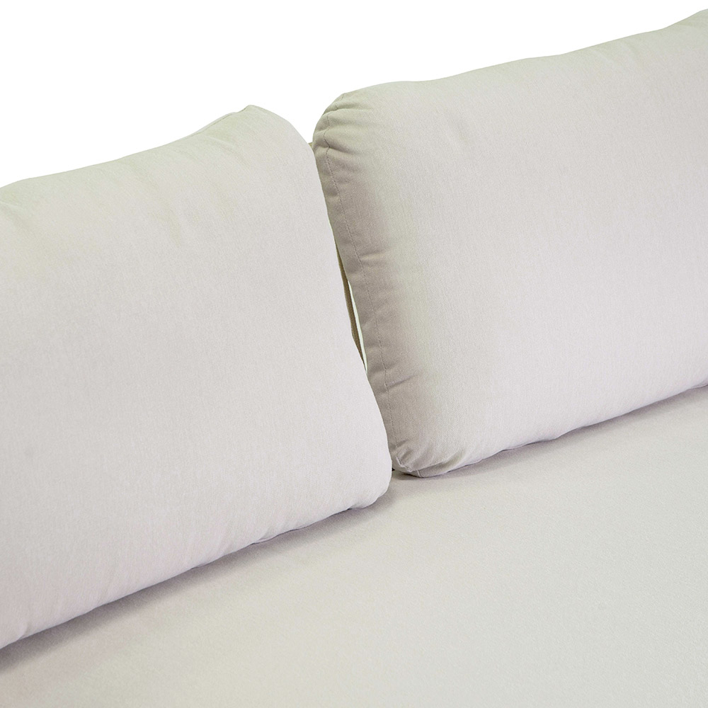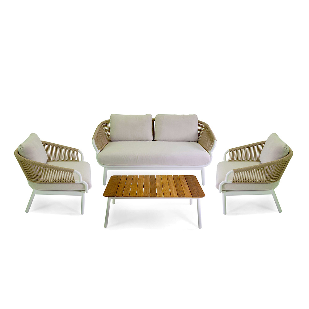 Linjat elegante dhe përfundimet e rafinuara pasurohen nga litarët, të cilët jo vetëm shtojnë një prekje të sofistikimit vizual , por edhe ajrim ideal gjatë muajve të ngrohtë. Jastëkët e butë dhe të trashë ofrojnë rehati maksimale, duke ftuar momente relaksi nën diell ose yje.