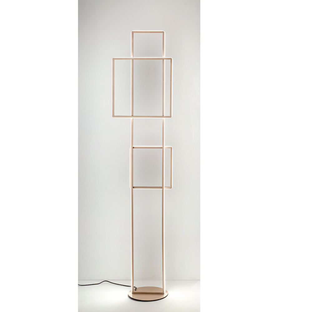 Llambë dyshemeje LED në metal të lyer me ar ose argjend, dizajn modern.