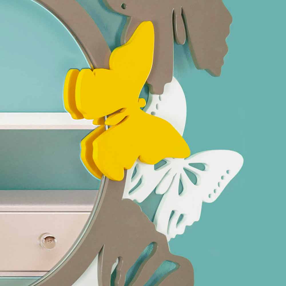 Pasqyrë muri moderne dhe e rrumbullakët, në dru me ngjyrë me flutura dekorative, e prodhuar në dizajn Itali.