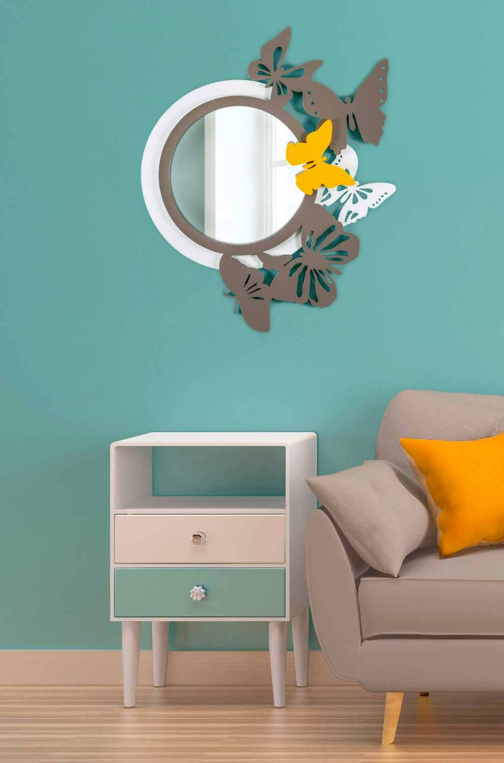 Dizajn modern Pasqyrë e rrumbullakët në dru me ngjyra me flutura - Mundi