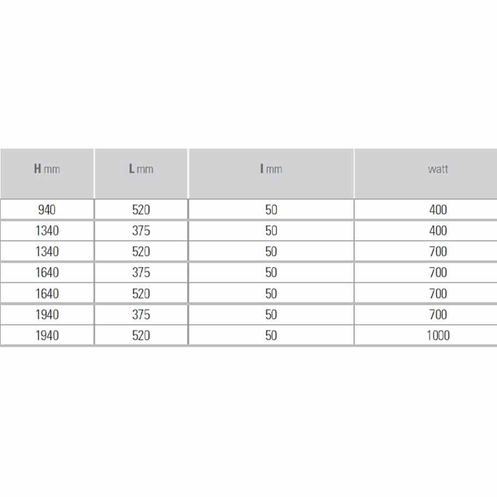 - H 1230 x L 375 x Inter.50 x P 48 mm x Rendimenti w 400;