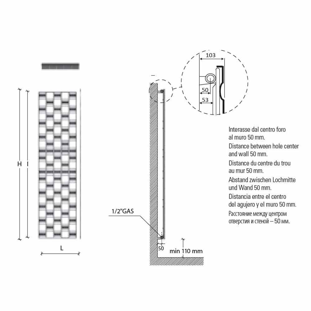 - H 1815 x L 503 x Ndër. 1760 mm x Dalja w (Δt50 *) 815; Rendimenti w (Δt30 *) 429; Rendimenti w (Δt26 *) 358