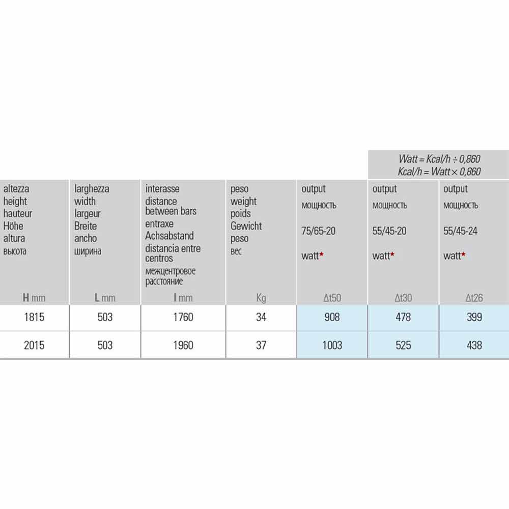 - H 1815 x L 503 x Ndër. 1760 mm x Dalja w (Δt50 *) 908; Rendimenti w (Δt30 *) 478; Rendimenti w (Δt26 *) 399