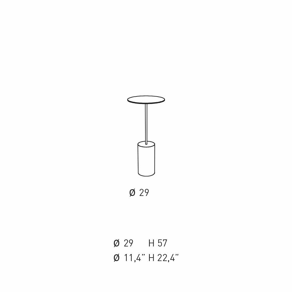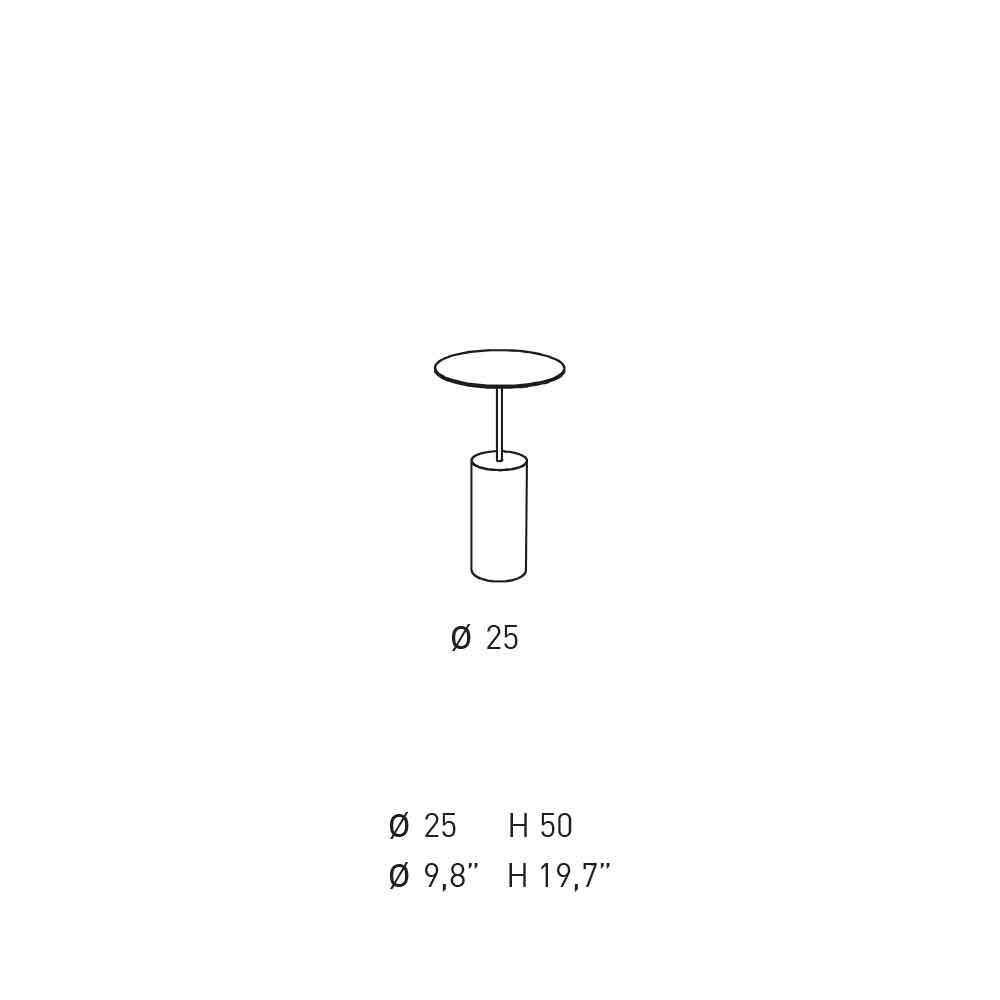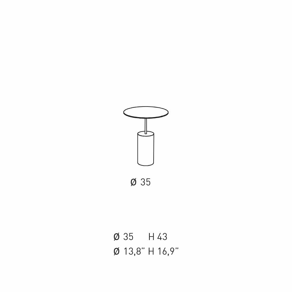 E disponueshme në tre madhësi të ndryshme , kjo tavolinë kafeje mund të arredojë ambjentin individualisht ose në shoqërinë e varianteve të saj, për një efekt më bashkëkohor dhe me ngjyra. Dizajni i tij karakterizohet nga një disk çeliku i pozicionuar në një tub metalik i cili nga ana tjetër mbështetet nga një bazë cilindrike. Rezultati është një lojë e ekuilibrave të këndshëm dhe simetrive befasuese.