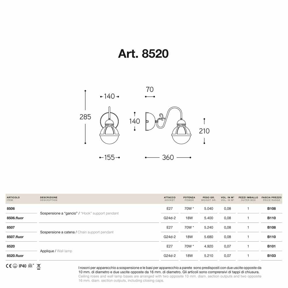 Cimosa është në dispozicion me fole të ndryshme: - pajisje me prizë për llambë standarde E27 - 70 W - pajisje me prizë për llambë fluoreshente kompakte G24d-2- 18 W Llamba nuk përfshihet