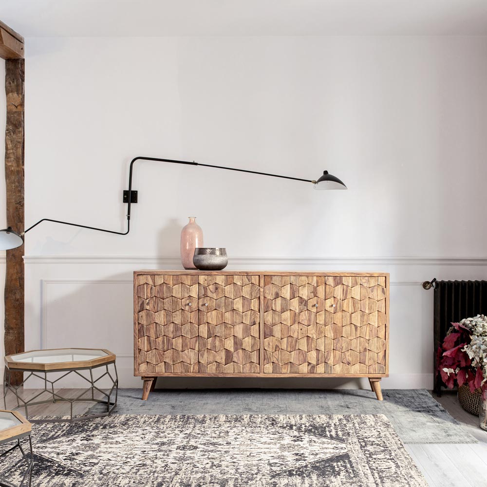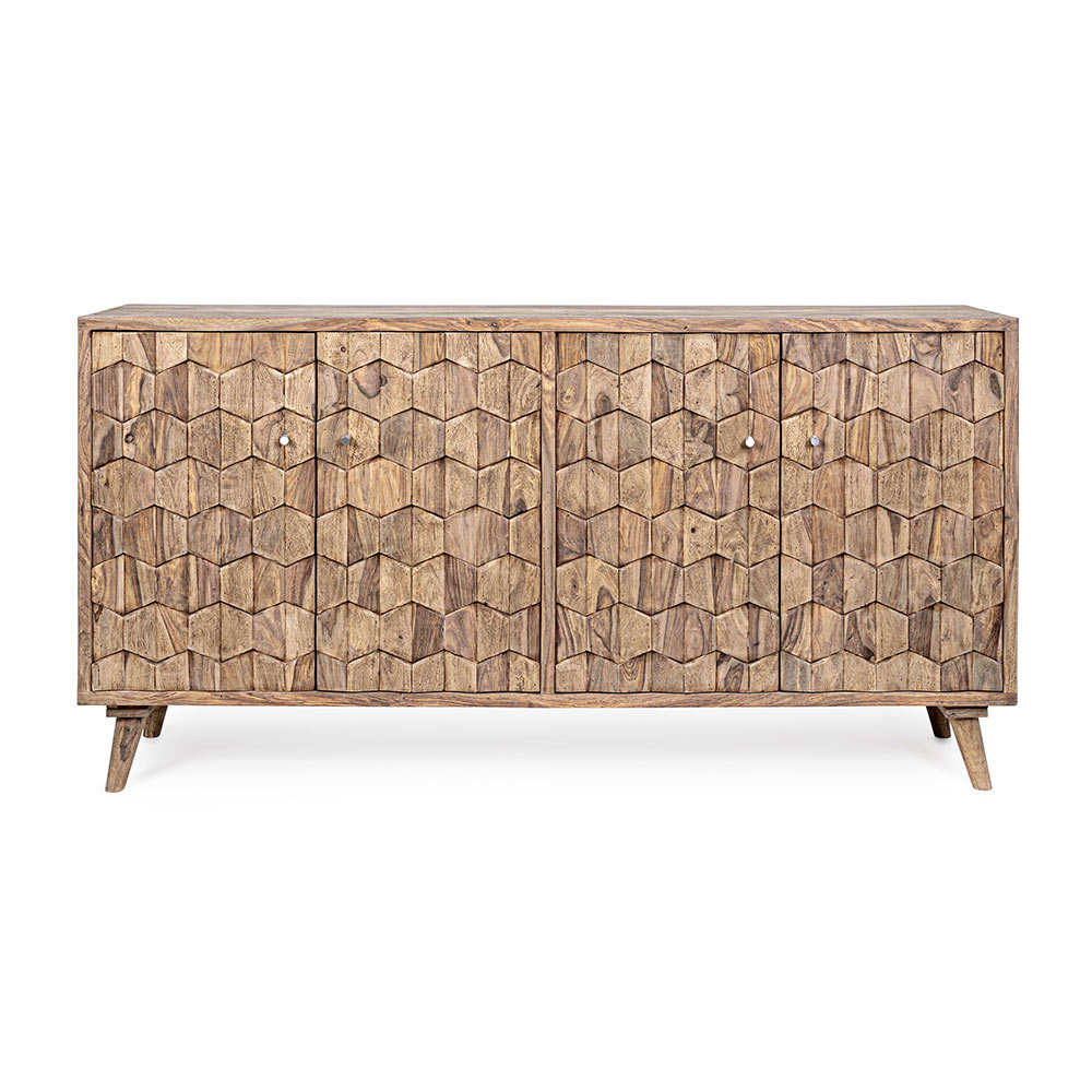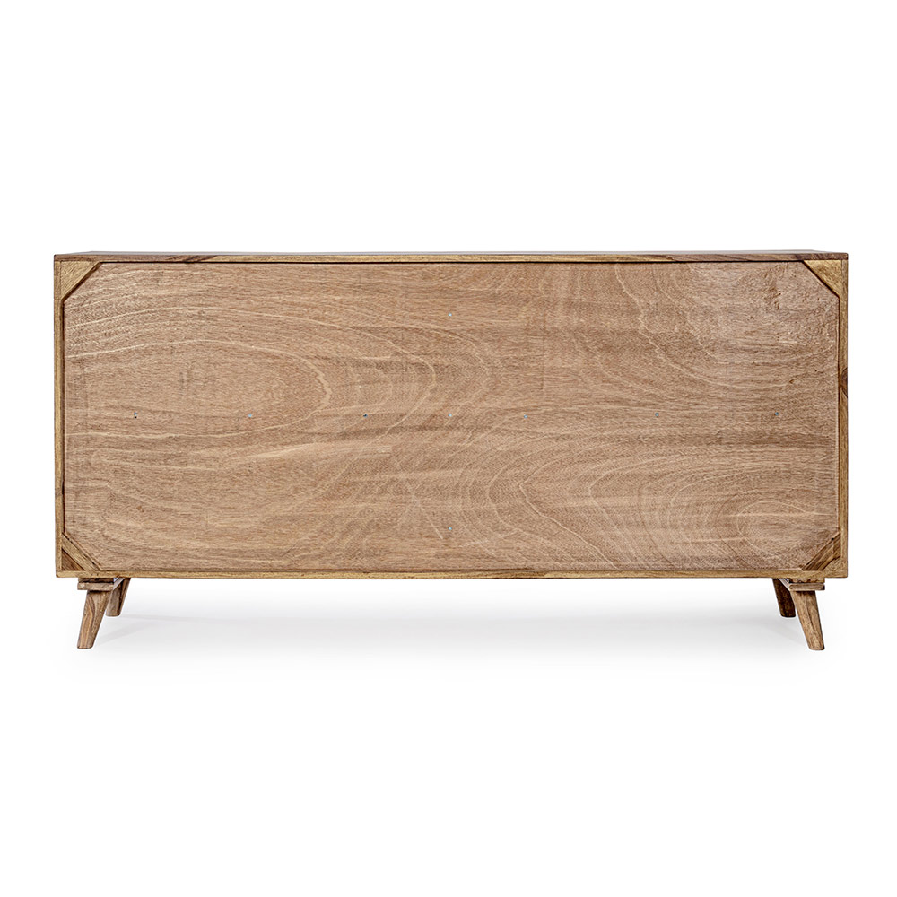 Ky bufe me dizajn për dhomën e ndenjes ka një strukturë druri sheesham , me pjesën e pasme të kompensatës dhe pjesën e poshtme të sirtarëve.