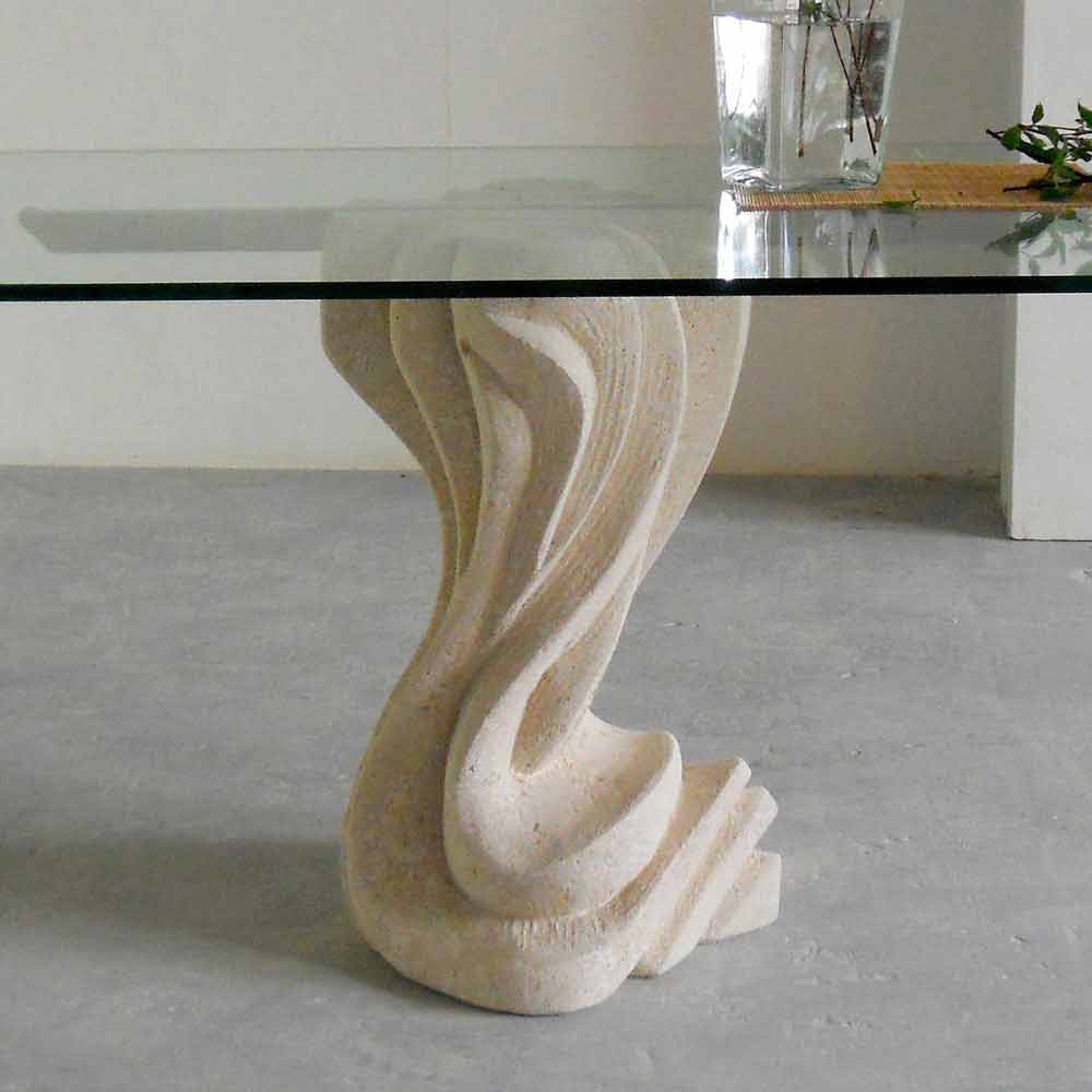 Tavolina e ngrënies Agave është bërë plotësisht në Itali. Baza e saj është prej guri natyror Vicenza dhe është gdhendur me dorë nga blloku origjinal i gurit. Tavolina e sipërme është bërë nga kristali float (trashësi 15 mm) e cila mbështetet nga një shirit metalik i lyer me furçë.
