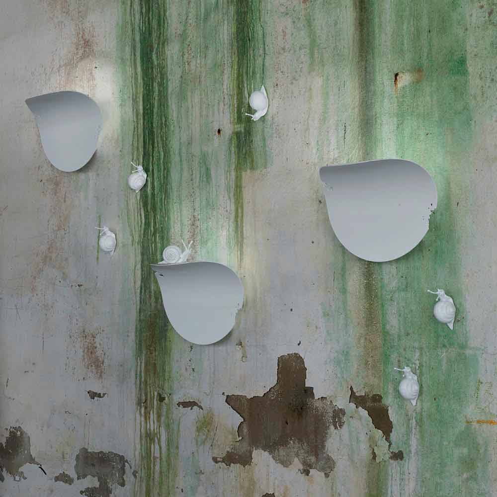 Llamba është bërë prej alumini të bardhë ndërsa aksesori në formë kërmilli në qeramikë të bardhë opake, për një dizajn krejtësisht italian , i cili, përmes eksperimentimeve jokonvencionale dhe kërkimeve të vazhdueshme midis traditës dhe modernitetit , është në gjendje të mahnisë, guxojë dhe të entuziazmojë. duke ju lejuar të shprehni emocionet tuaja përmes një përdorimi origjinal dhe personal dekorativ të dritës.