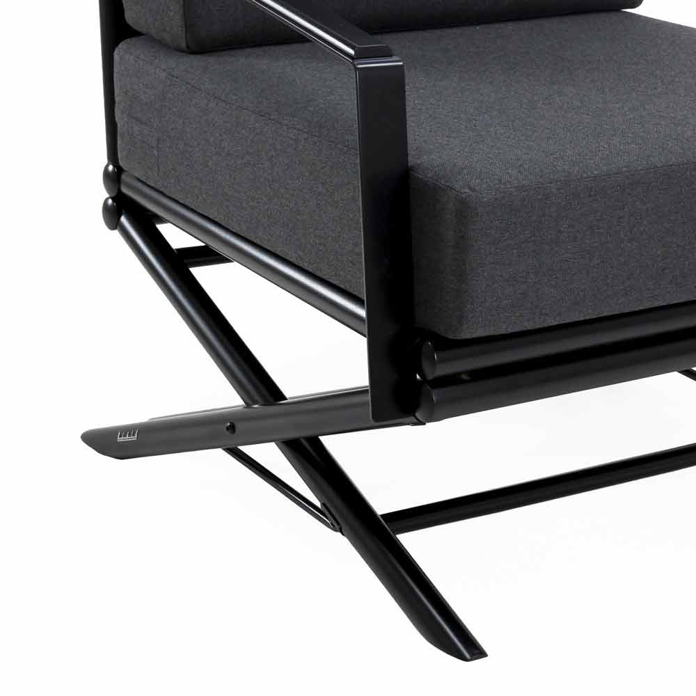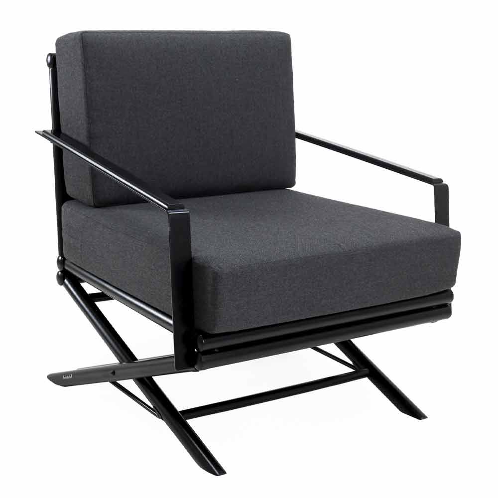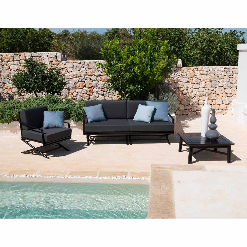 Kolltuk i relaksuar për ambiente të jashtme me strukturë natyrale ose druri të zezë, sedilje batyline dhe jastëkë pëlhure, luks i prodhuar në Itali