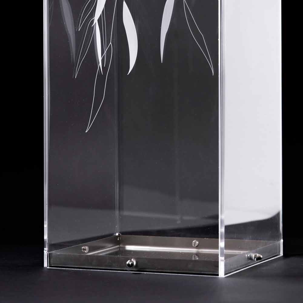 Mbështetja e ombrellës në pleksiglas transparente karakterizohet nga dekorimet me gjetje lazer të gjetheve dhe bazës në çelik inox.