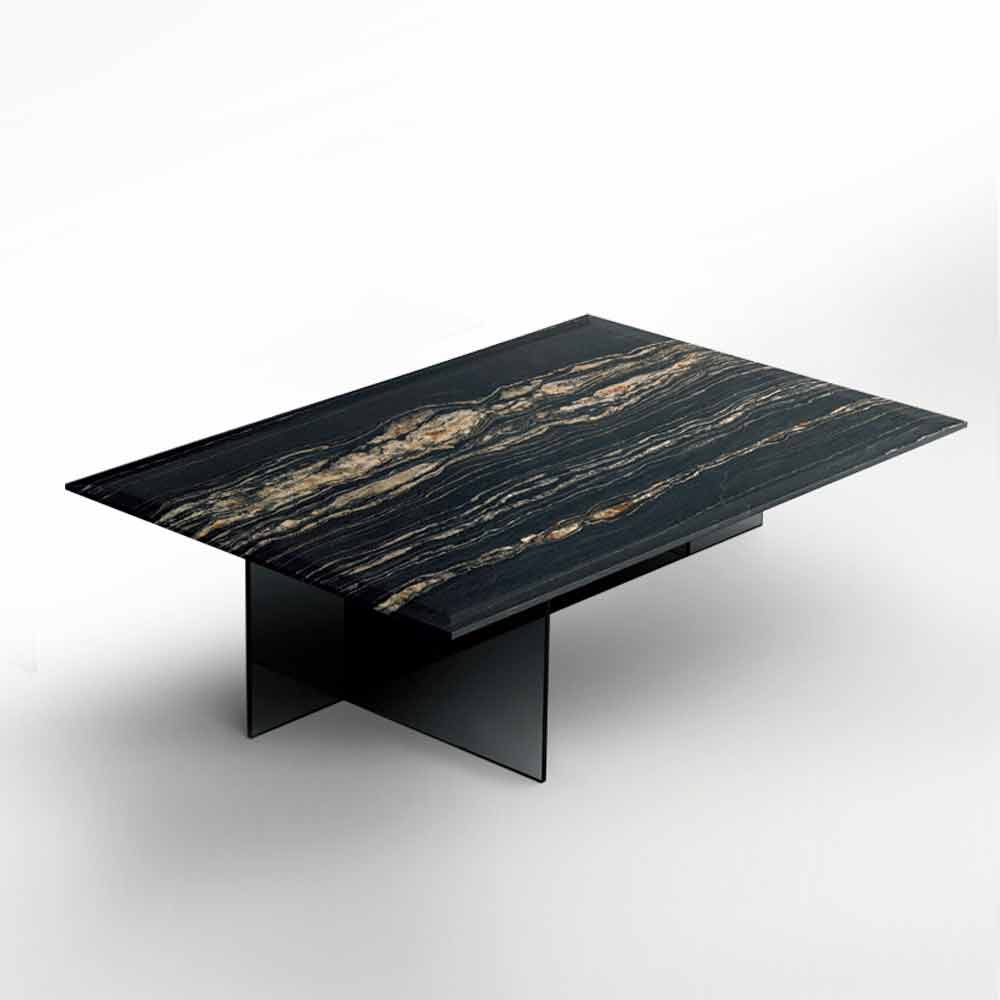Tavolinë kafeje në mermer të pjerrët me bazë qelqi të modelit Made in Italy.