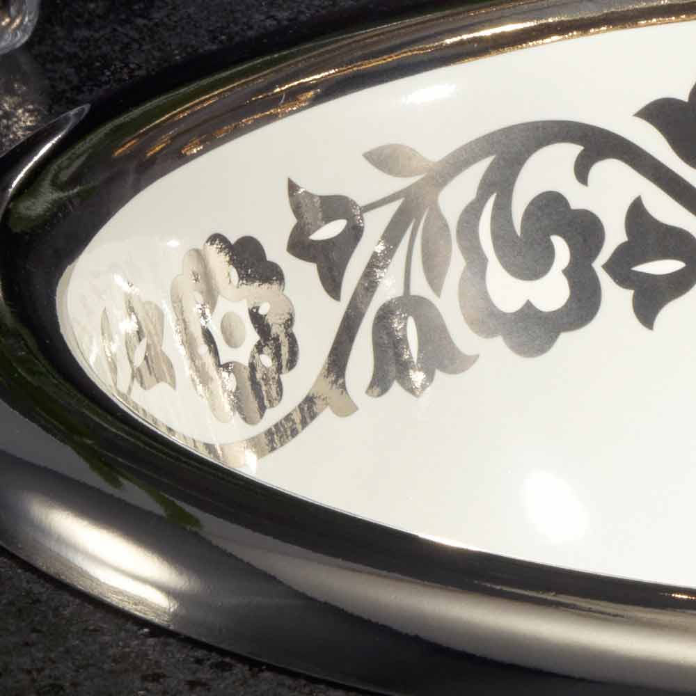 Lavaman i integruar i banjës i bërë në Itali në argjilë prej argjile, i bërë me dorë, i zbukuruar me shirita me lule platini dhe ari, dora pikturuar në platin.