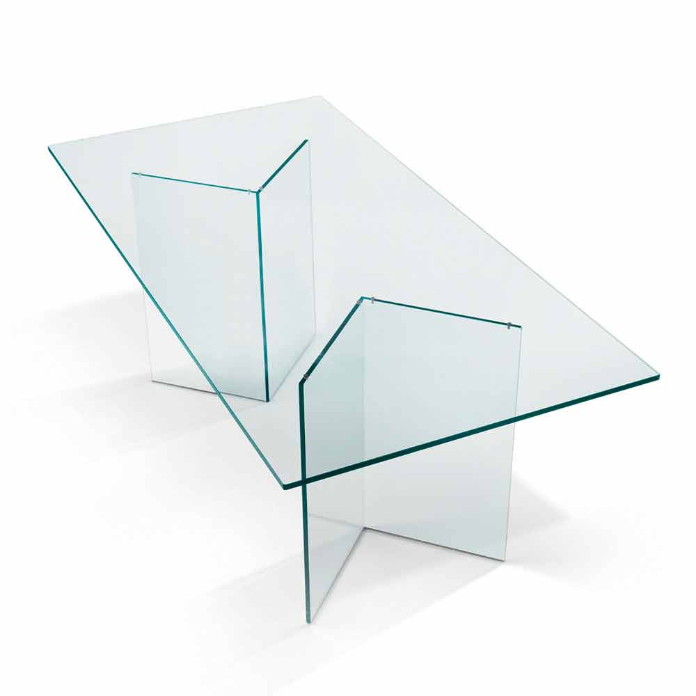 Kjo tryezë ngrënie drejtkëndëshe është tërësisht e bërë prej qelqi ekstra të pastër, me një strukturë të përbërë nga dy mbështetëse xhami që mund të rregullohen paralele ose spekulare në varësi të përdorimit.