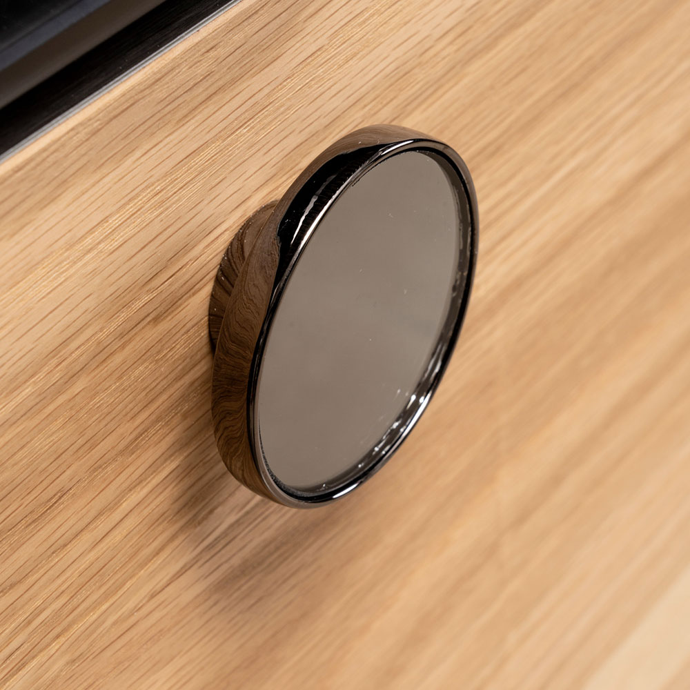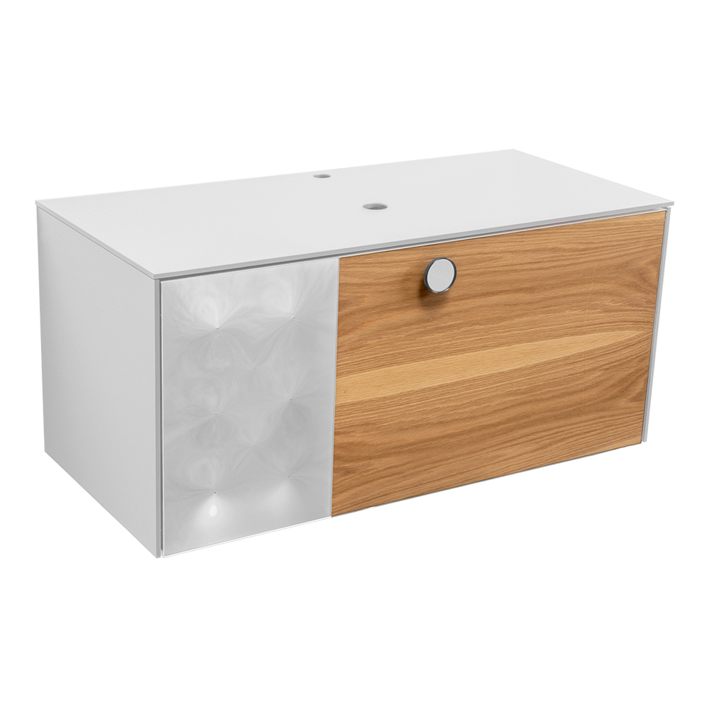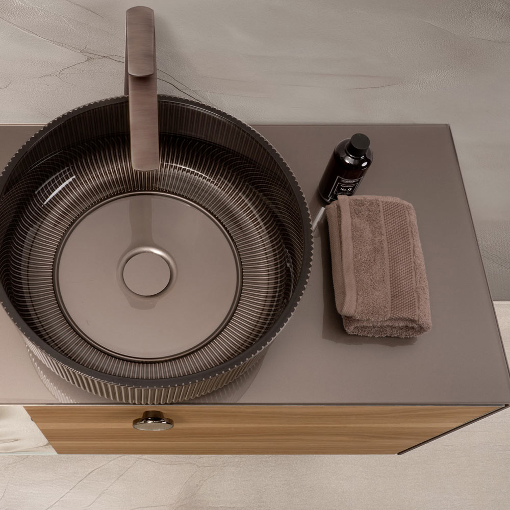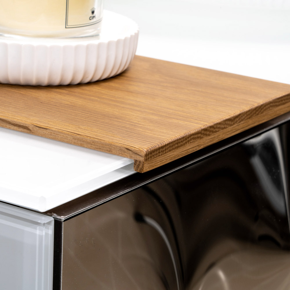 Pjesa qendrore prej druri natyral me fibra të dukshme kombinohet në mënyrë harmonike me pjesën e sipërme dhe anët, të cilat janë bërë prej qelqi me ngjyrë të temperuar jashtëzakonisht të tejdukshëm 8 mm . Futja anësore e sirtarit është prej qelqi të lakuar , i karakterizuar nga një efekt tre-dimensional me reflektime të shkëlqyera, duke pasuruar kështu dizajnin me një detaj dallues dhe të rafinuar.