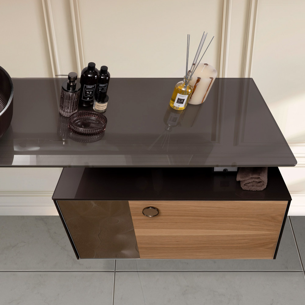 Pjesa qendrore prej druri natyral me fibra të dukshme kombinohet në mënyrë harmonike me pjesën e sipërme dhe anët, të cilat janë bërë prej qelqi me ngjyrë të temperuar jashtëzakonisht të tejdukshëm 8 mm . Futja anësore e sirtarit është prej qelqi të lakuar , i karakterizuar nga një efekt tre-dimensional me reflektime të shkëlqyera, duke pasuruar kështu dizajnin me një detaj dallues dhe të rafinuar.