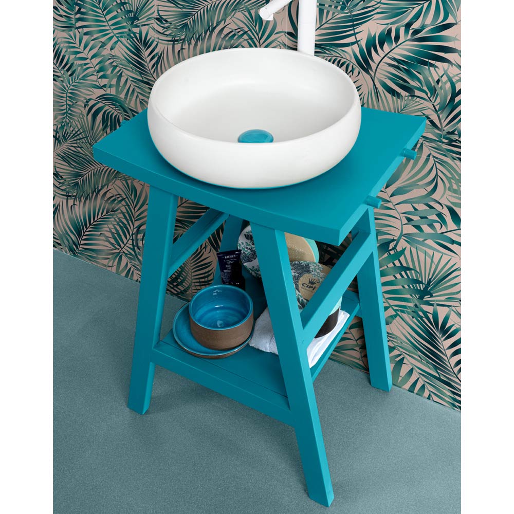 Kabineti i banjës me qëndrim të lirë i bërë nga dru tik i lyer me ngjyrë blu të rikuperuar natyral , një ngjyrë që i referohet qetësisë dhe qetësisë, duke krijuar ndjesinë e një zhytjeje në blunë e detit Sardenjë, një emocion që i referohet sharmit dërrmues të natyrës së brendshme. Struktura e saj karakterizohet nga forma paksa e lakuar e majës që ofron një prekje ekskluzive dhe të rafinuar në estetikën e produktit. I kompletuar me 4 grepa praktike për peshqirë dhe raft funksional të ruajtjes .