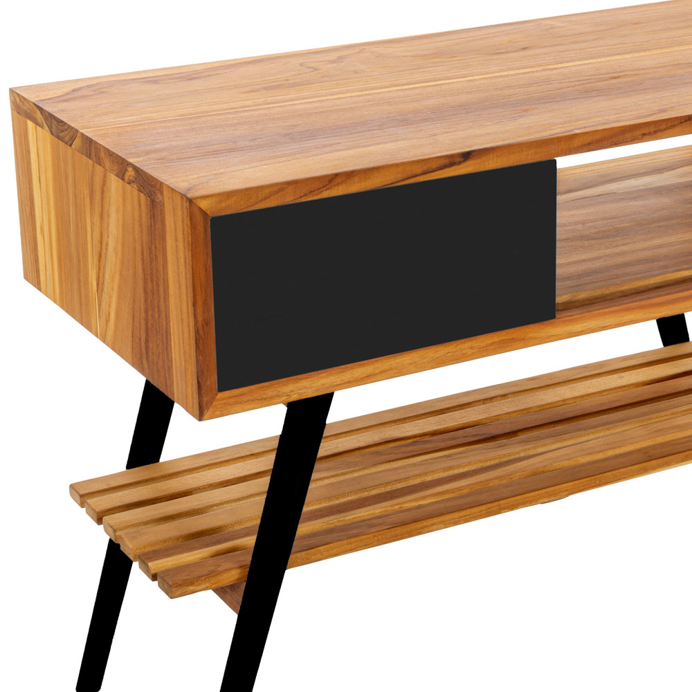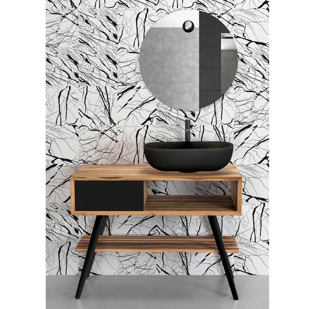 Dollap banjoshnë këmbë të lirë në dru tik natyral të ricikluar me sirtar prej druri sofër të lyer me ngjyrë të zezë mat për t'u përshtatur me këmbët. Një zgjedhje ngjyrash elegante dhe me stil që bie në sy në çdo situatë arredimi, duke e bërë atë magjepsëse dhe misterioze dhe që tregon për atmosfera ekskluzive dhe emocione unike. Një estetikë e qëllimshme grafike e përmirësuar edhe më shumë nga praktika e dimensioneve të saj, të cilat e bëjnë atë të përsosur për arredimin e hapësirave të vogla që kanë nevojë për një protagonist elegant dhe funksional .