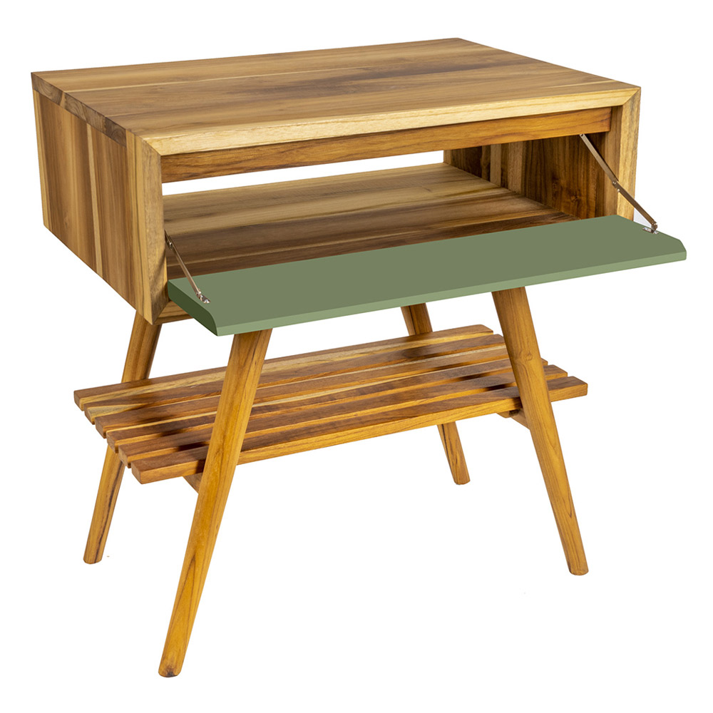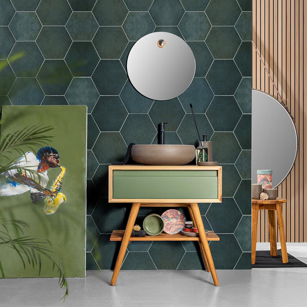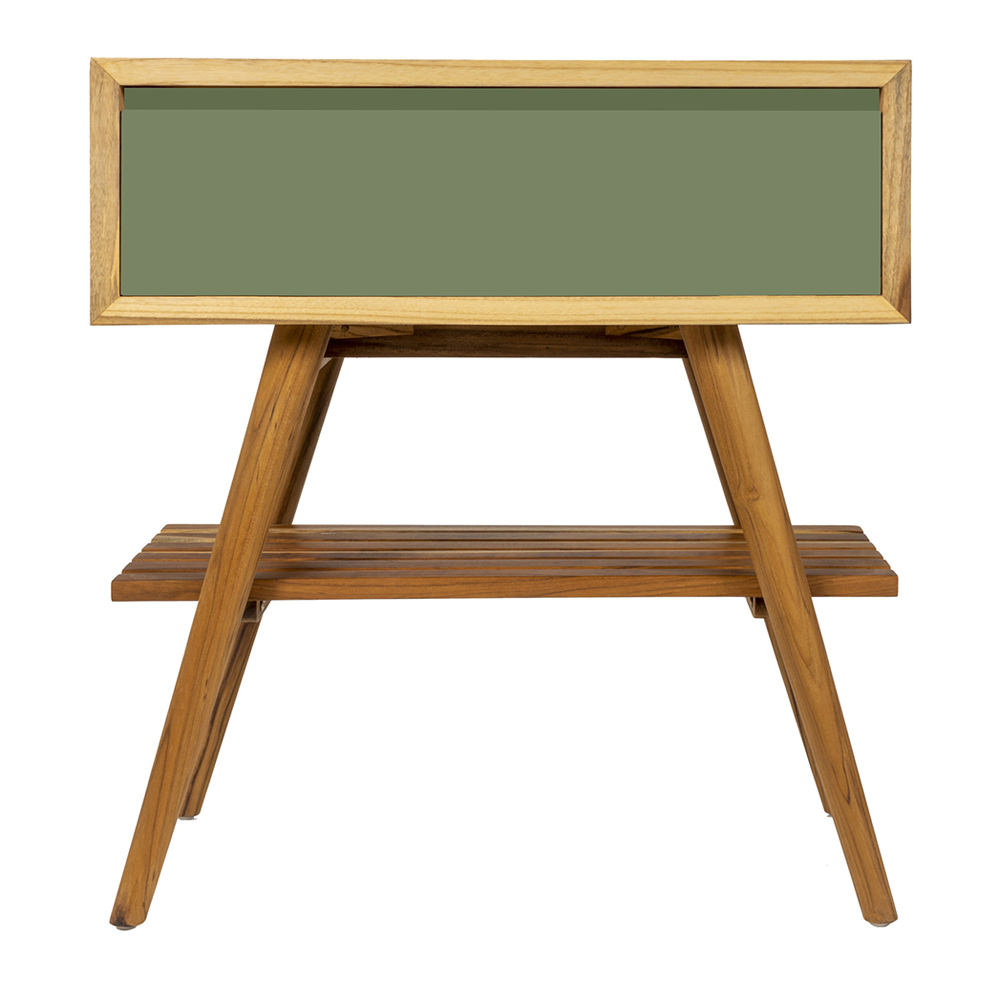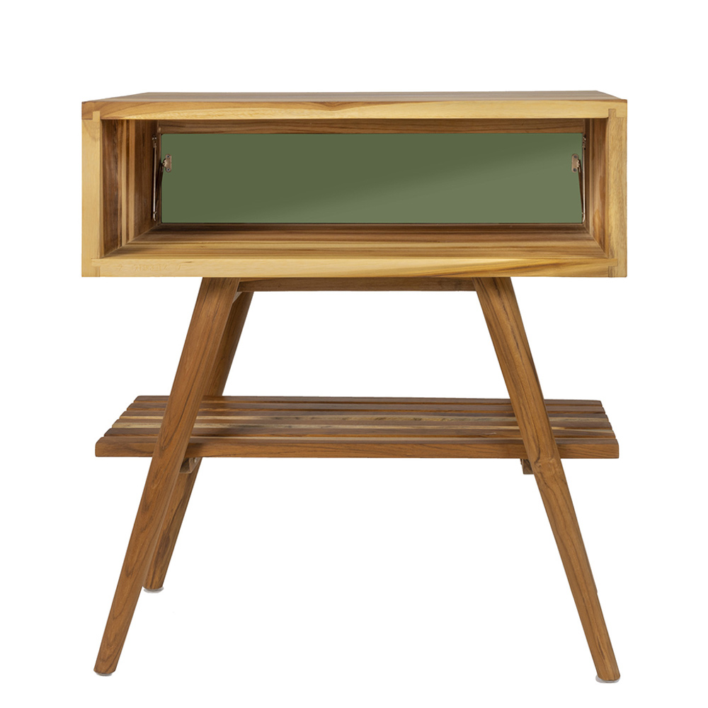 Dollap banjosh në dysheme, prej dru tik të rikuperuarnatyral , me sirtar me kapak në dru të gjelbërsofër , një nuancë që lidhet me gjithçka që kujton natyrën, pranverën dhe lulëzimin e bimëve dhe që tregon pjellori, rinovim dhe shpresë. Struktura e saj karakterizohet nga forma të thjeshta dhe hapësira praktike ideale për organizimin e zonës së banjës në mënyrë elegante dhe funksionale për një rezultat origjinal me një personalitet të fortë modern .