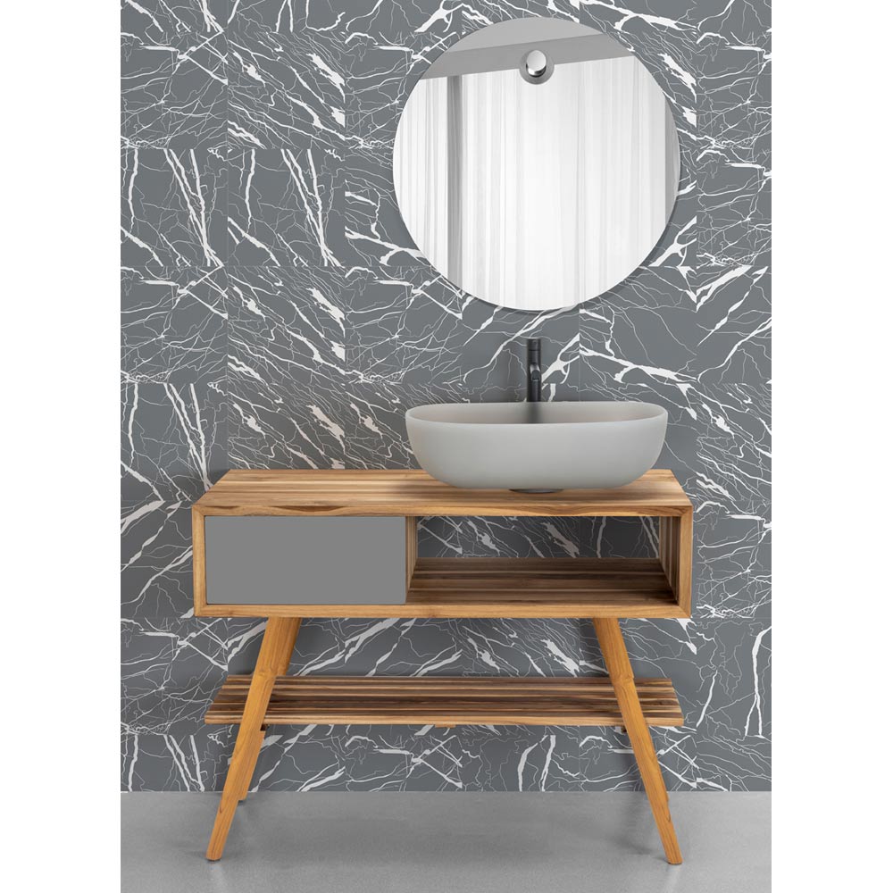 Dollap banjoje i pavarur me strukturë prej tik natyral të rikuperuar me sirtar anësor prej druri mahagoni gri mat , një nuancë ngjyrash e përjetshme që flet gjuhën ndërkombëtare të elegancës, duke e bërë atë të përsosur në çdo mjedis dhe duke u vënë re në mënyrë diskrete. Një estetikë e qëllimshme grafike e përmirësuar edhe më shumë nga praktika e dimensioneve të saj, të cilat e bëjnë atë të përsosur për arredimin e hapësirave të vogla që kanë nevojë për një protagonist elegant dhe funksional .