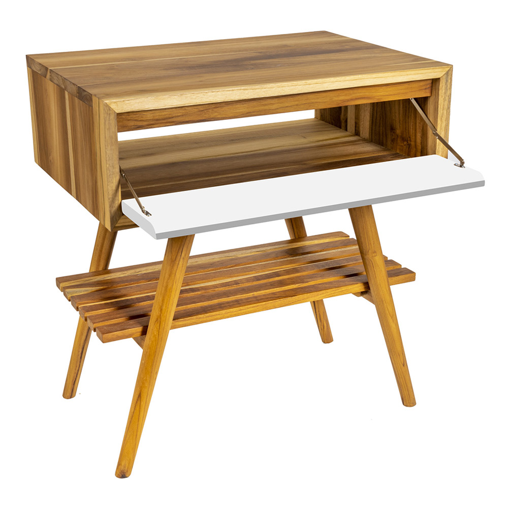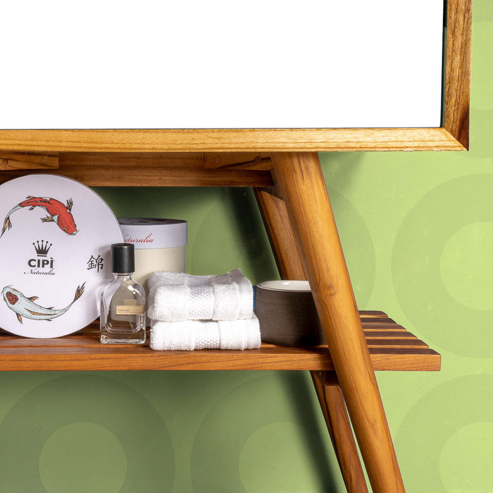 Dollap banjojeme qëndrim të lirë, me strukturë dru tik natyral të ricikluar dhe sirtar me kapak në dru të bardhësofër , një ngjyrë që përfaqëson konceptin e paqes, lirisë, pastrimit dhe një fillimi të ri, duke sjellë në mendje bardhësinë e borës dhe shkëlqimin e natyrës në forma më e pastër. Struktura e saj karakterizohet nga forma të thjeshta dhe hapësira praktike ideale për organizimin e zonës së banjës në mënyrë elegante dhe funksionale për një rezultat origjinal me një personalitet të fortë modern .