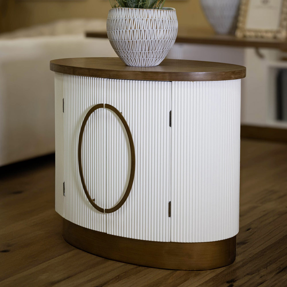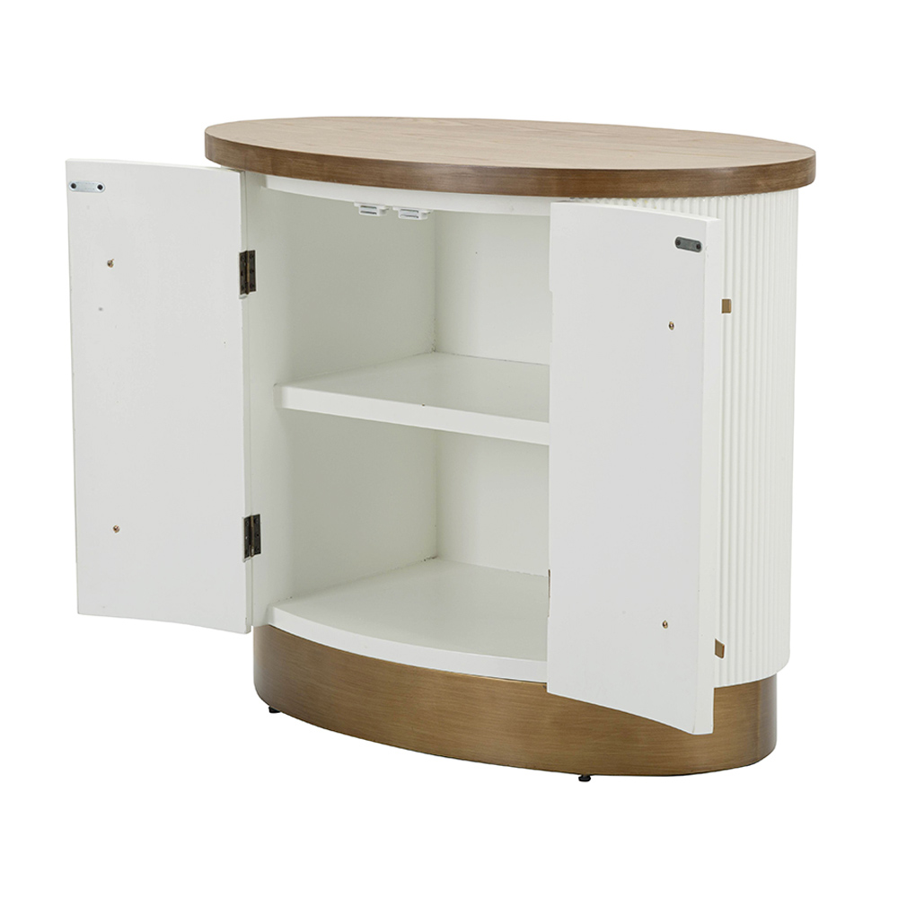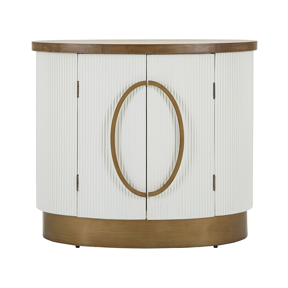 Brazda e zgjuar e dyerve shton një lojë delikate të dritës dhe hijes, ndërsa dorezat rrethore sjellin një prekje të përsosjes . Kjo pjesë e mobiljeve ofron jo vetëm një pikë interesi estetik, por edhe kapacitet të bollshëm ruajtjeje, duke e bërë atë sa praktike aq edhe të bukur.