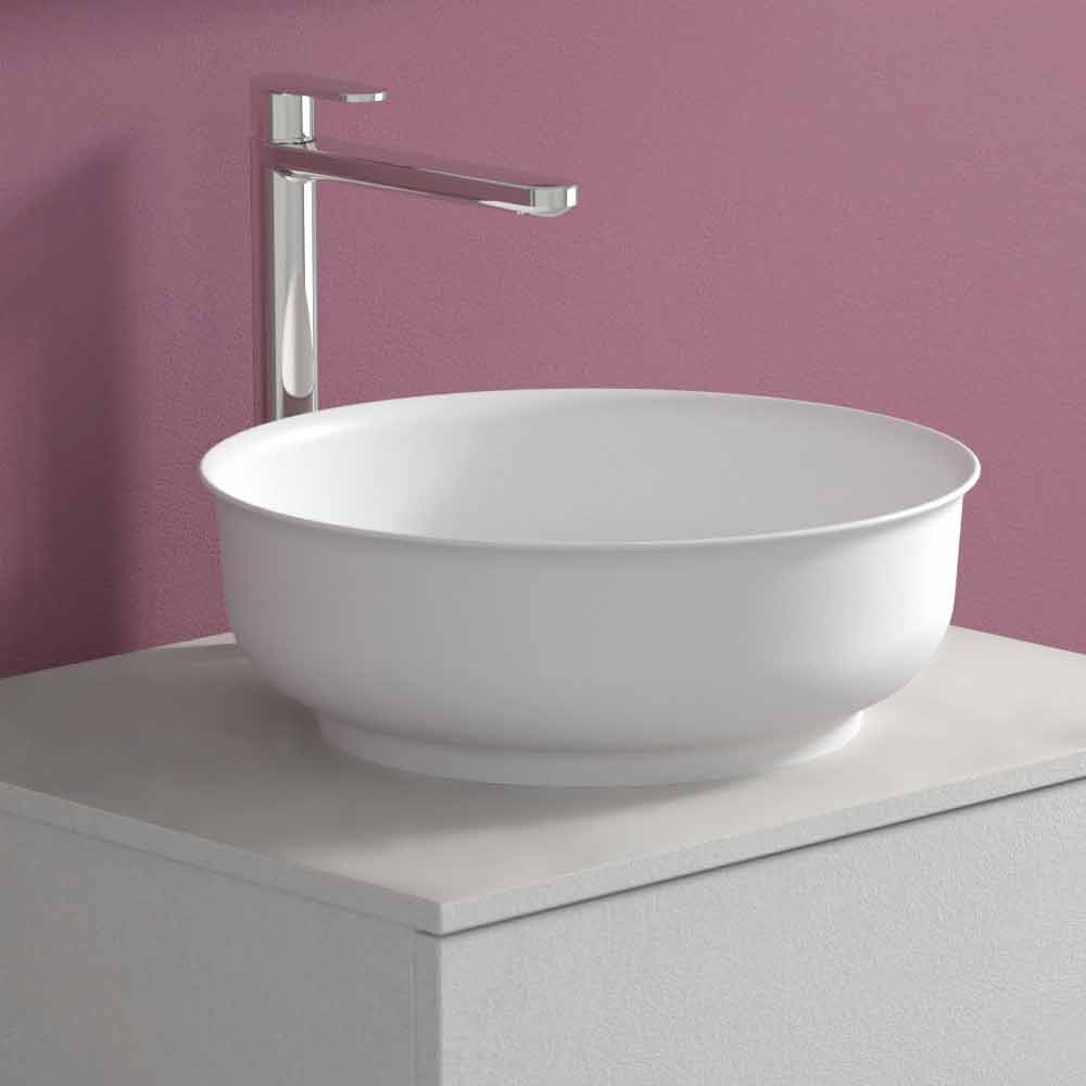 Countertop lavaman Raundi është bërë nga mat ngurta, një rrëshirë errët mineral i bardhë, dhe përfundoi në gelcoat errët, që e bën produkti i papërshkueshëm nga uji.