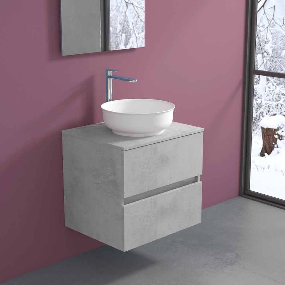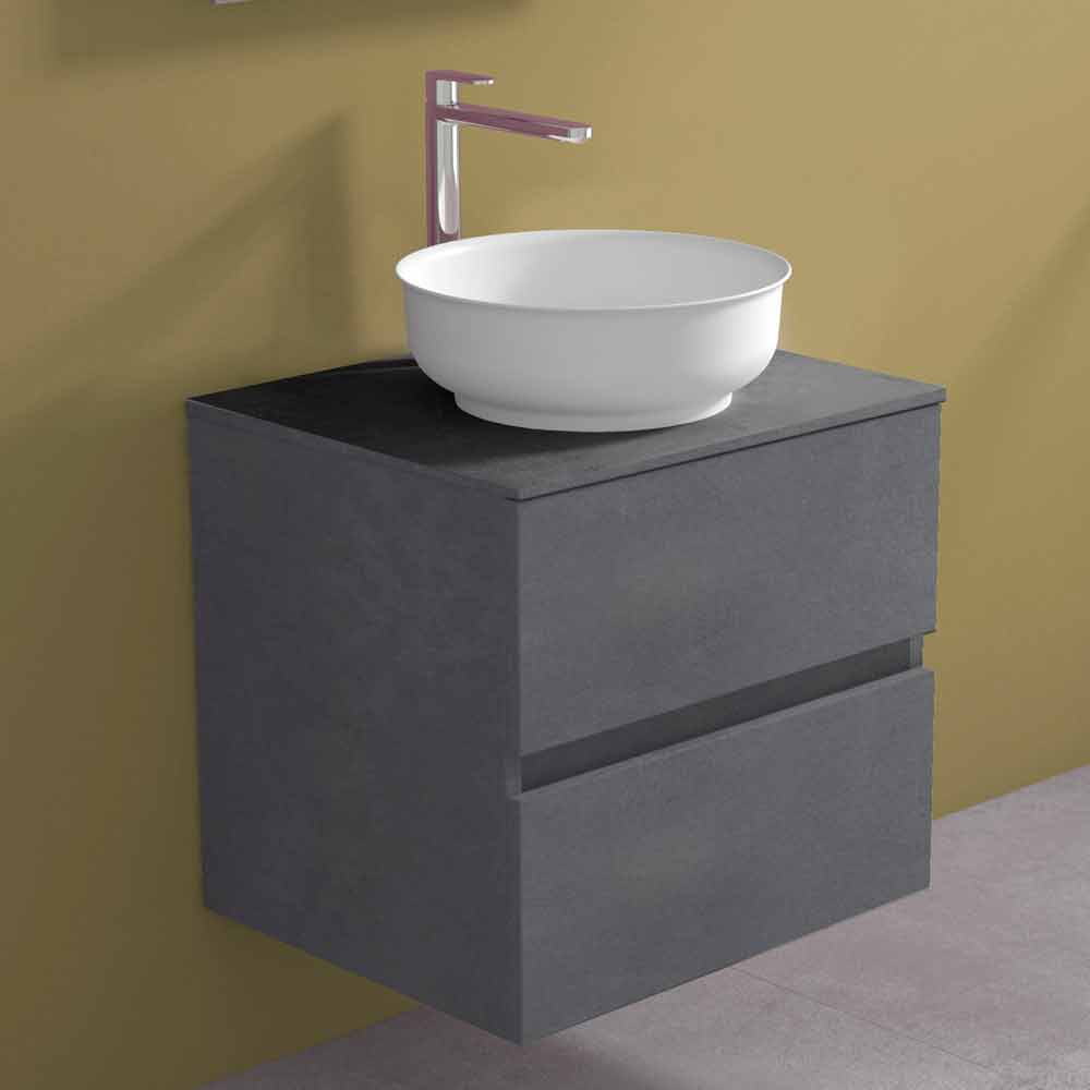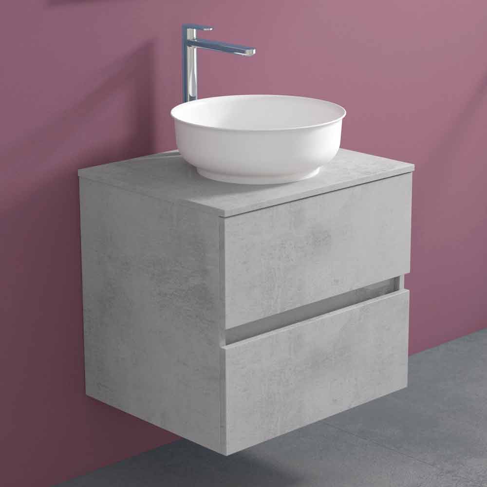 Isshtë një njësi mobiljesh e banjës me pezull me një lavaman countertop të rrumbullakët dhe elegant që i jep strukturës një dizajn modern dhe të sofistikuar që nuk dëshiron të heqë dorë nga praktika dhe funksionaliteti.