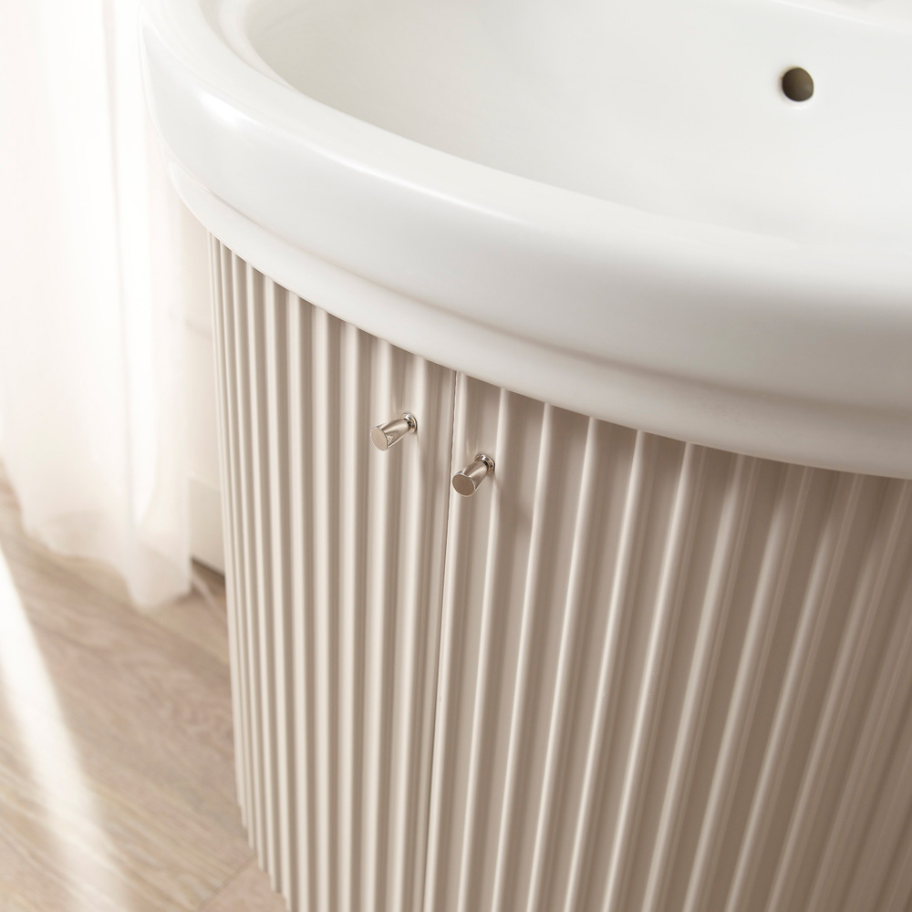 Dollap banjoje MDF me dy dyer me punim kanete , finiturë mat, një raftMDF Idro, i kompletuar me lavaman qeramik dhe pullanikel të përfshira me këmbë MDF të bardhë mat .