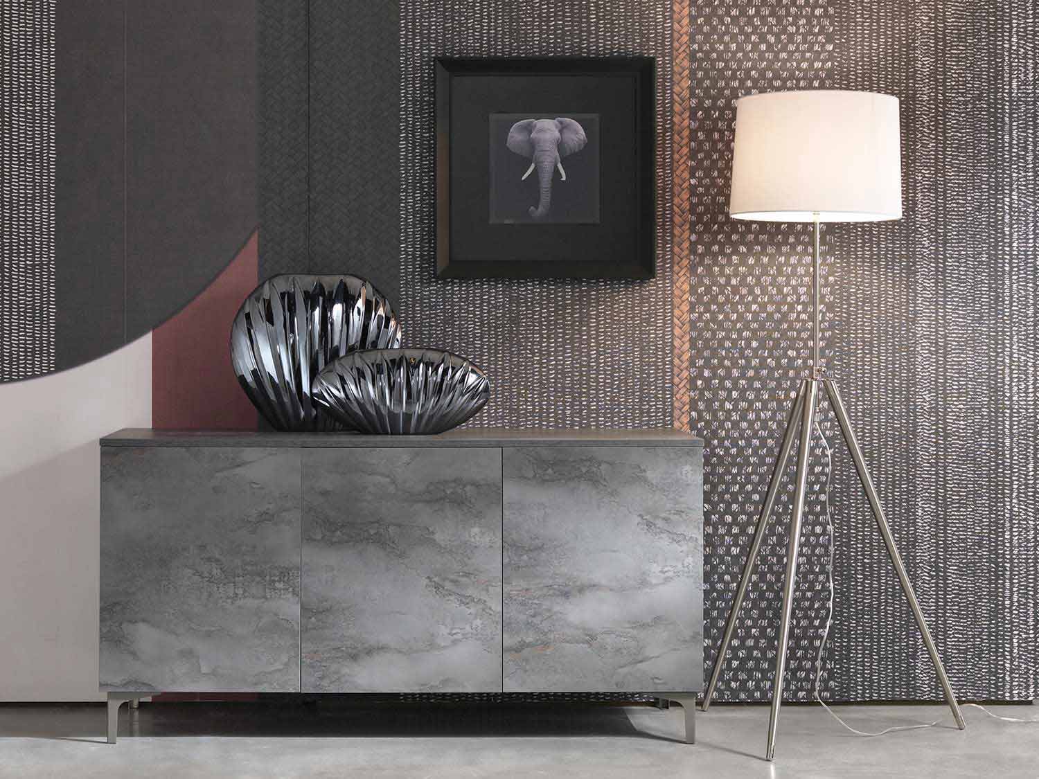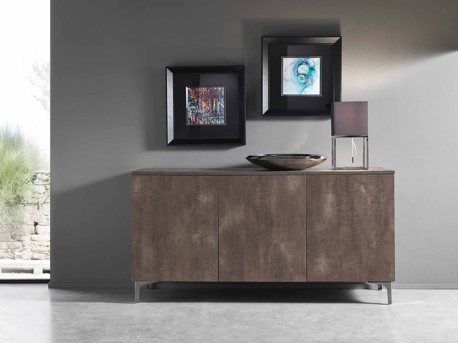 Dollap i dhomës së ndenjes me tre dyer, dizajn modern me bronz ose dru melamine gri të bërë në Itali.