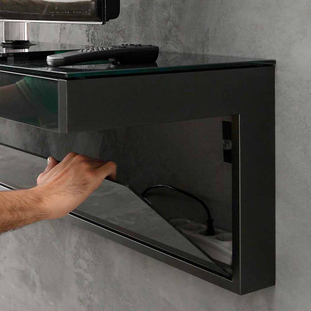 Kabineti ekskluziv i pezulluar i TV (montim në mur) i prodhuar në Itali me majë xhami të zezë me shkëlqim me vrimë kabllo, strukturë metalike të pikturuar me të zezë mat dhe panel të hequr vertikal të pleksiglasit. Isshtë gjithashtu i plotë me një sirtar të lëvizshëm përpara të pozicionuar nën pjesën e sipërme.