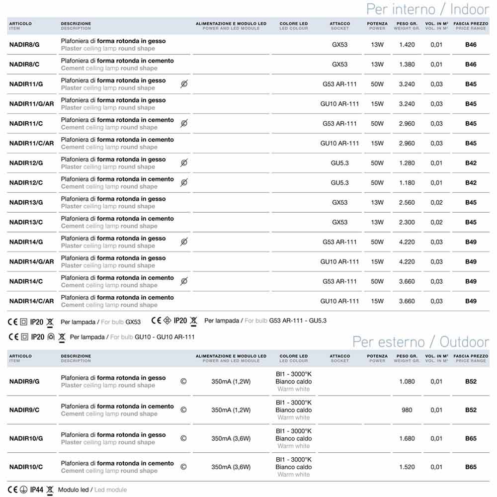 < Dritë tavani me dizajn modern Nadir 12 nga AldoBernardi , e disponueshme në version betoni ose suva. Konverteri LED NUK perfshihet.