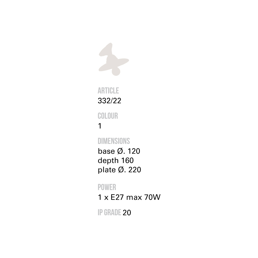 Dritë muri me kënd Settimello Toscot e prodhuar në Toskanë Seria Settimello e propozuar nga Toscot përfshin llamba varëse me një dizajn unik. Një stil rustik dhe retro, por gjithmonë aktual, i zbukuruar nga cilësia e materialeve dhe mjeshtëria e bërë tërësisht në Toskanë. E disponueshme ne nuanca te ndryshme, pa ndryshim cmimi. Shikoni grafikun e ngjyrave dhe vendosni kodin e dëshiruar të ngjyrës në kutinë e duhur. Dimensionet: Baza Ø12 Pllaka Ø22 TH.16 Llamba: 1 x E27 max 70W IP 20 - nuk përfshihen
