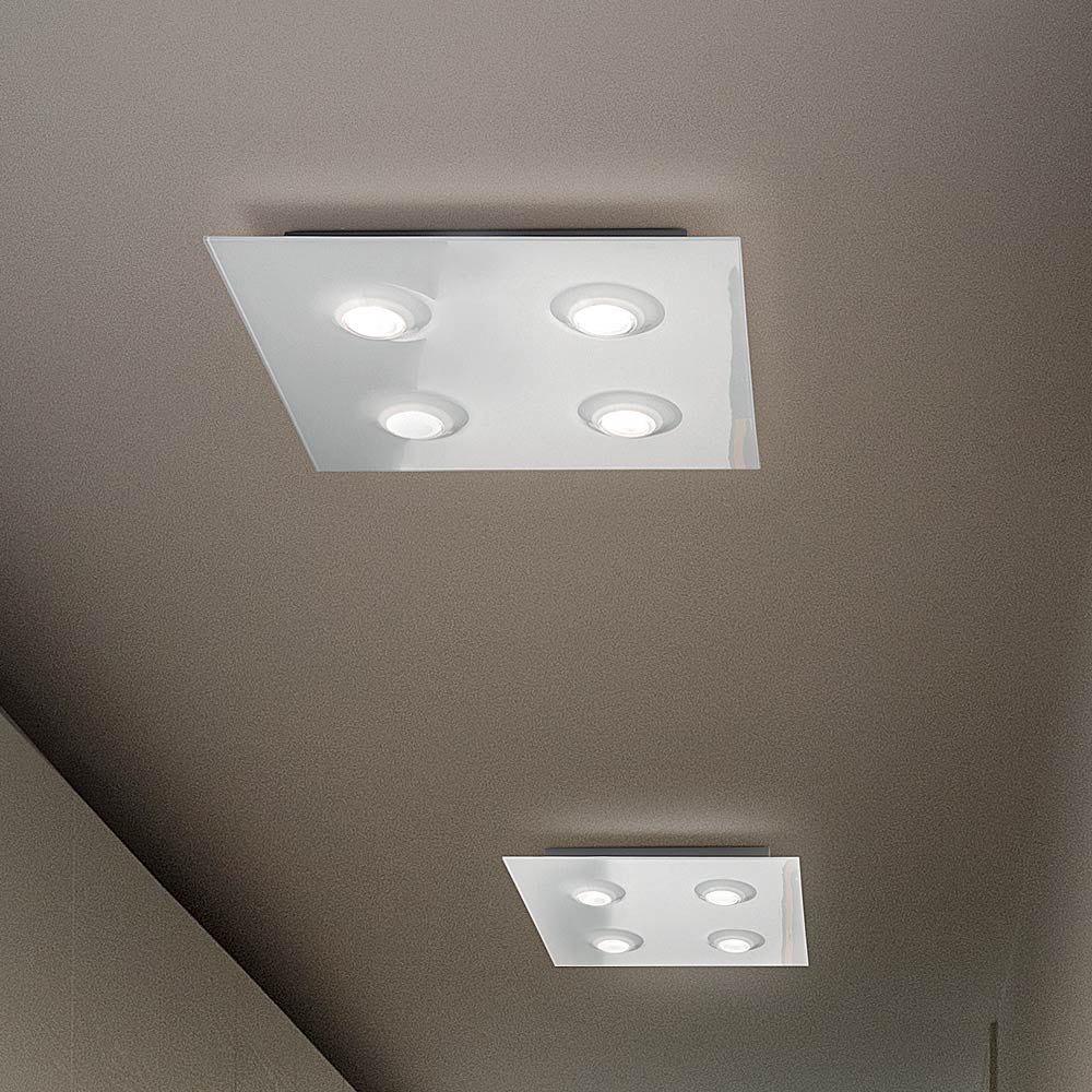 Ndriçues tavani për ambiente të brendshme i bërë nga një fletë e vetme qelqi e sheshtë me ulje të aplikuar me nxehtësi dhe një sistem fiksimi magnetik, i shpejtë dhe i thjeshtë, pa vida të dukshme.