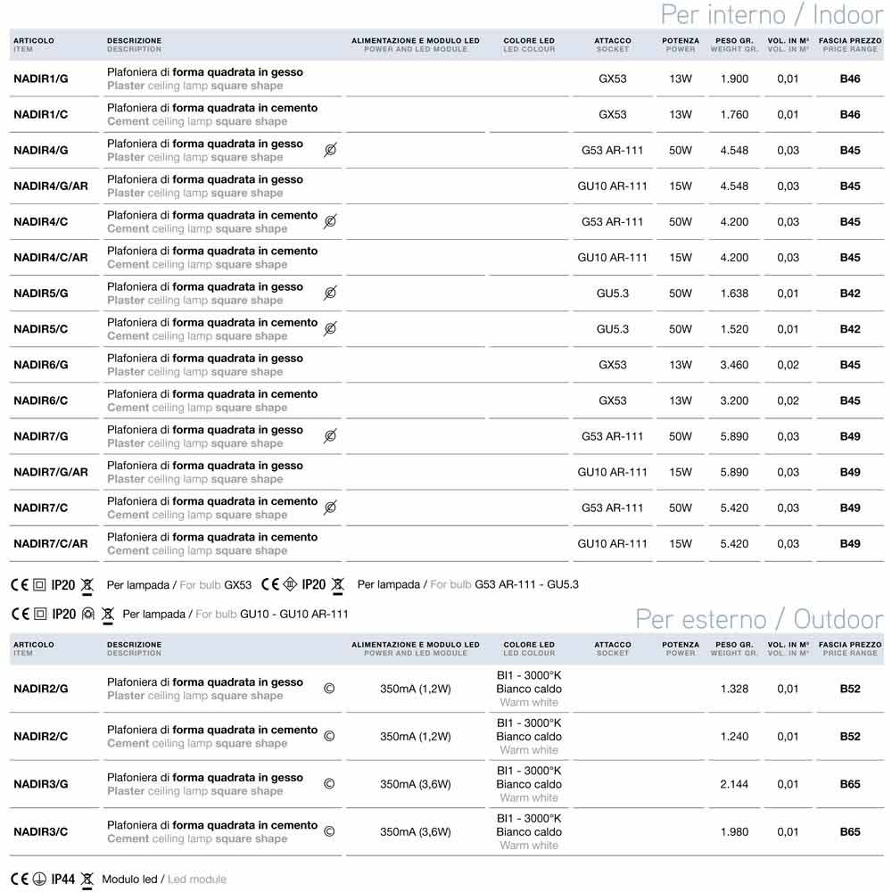 < Dritë tavani me formë moderne katrore Nadir nga AldoBernardi , e disponueshme në versionin e betonit ose suvasë.