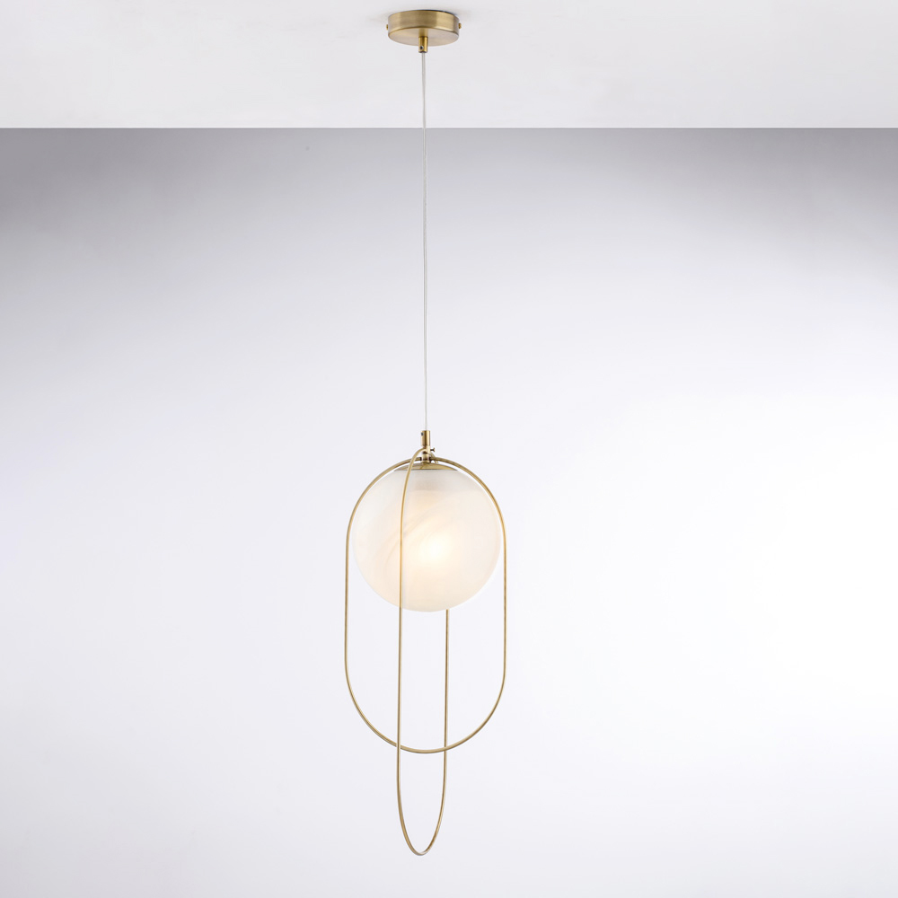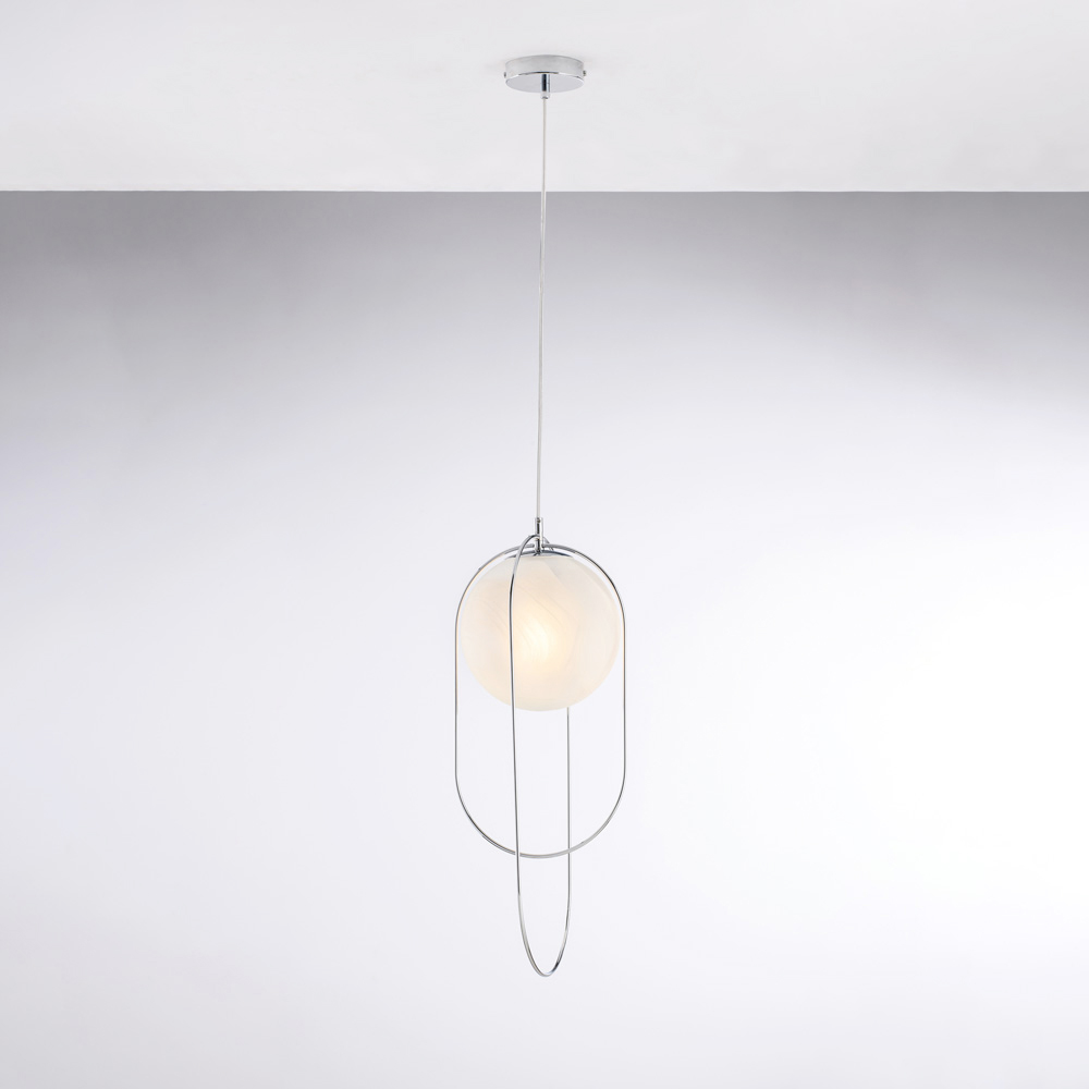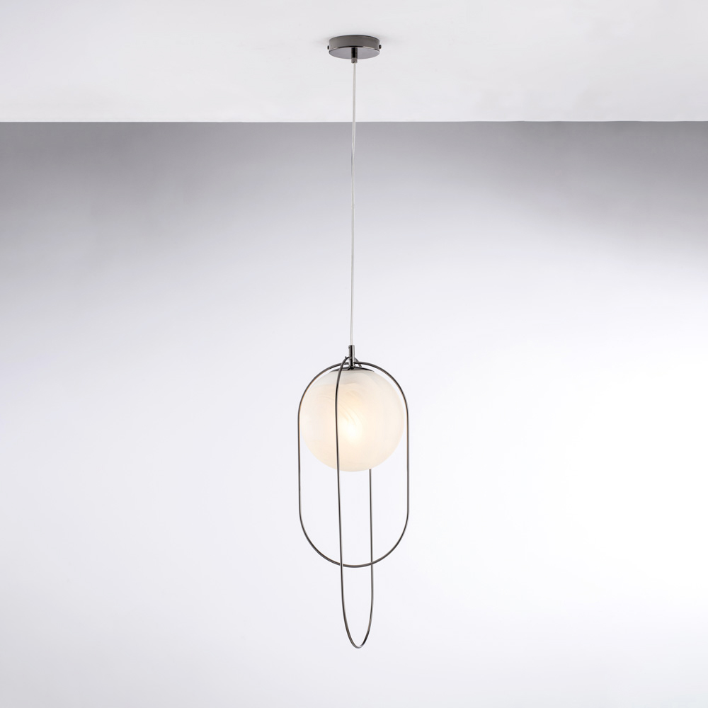 E thjeshtë dhe e sofistikuar, kjo dritë varëse prej hekuri me një sferë qelqi është një zgjidhje bashkëkohore ndriçimi, e projektuar për ata që vlerësojnë linjat e pastra dhe elegancën e përmbajtur. Struktura e hollë metalike përmban një sferë ndriçuese me diametër 20 cm , duke krijuar një ekuilibër të rafinuar midis formës dhe dritës.