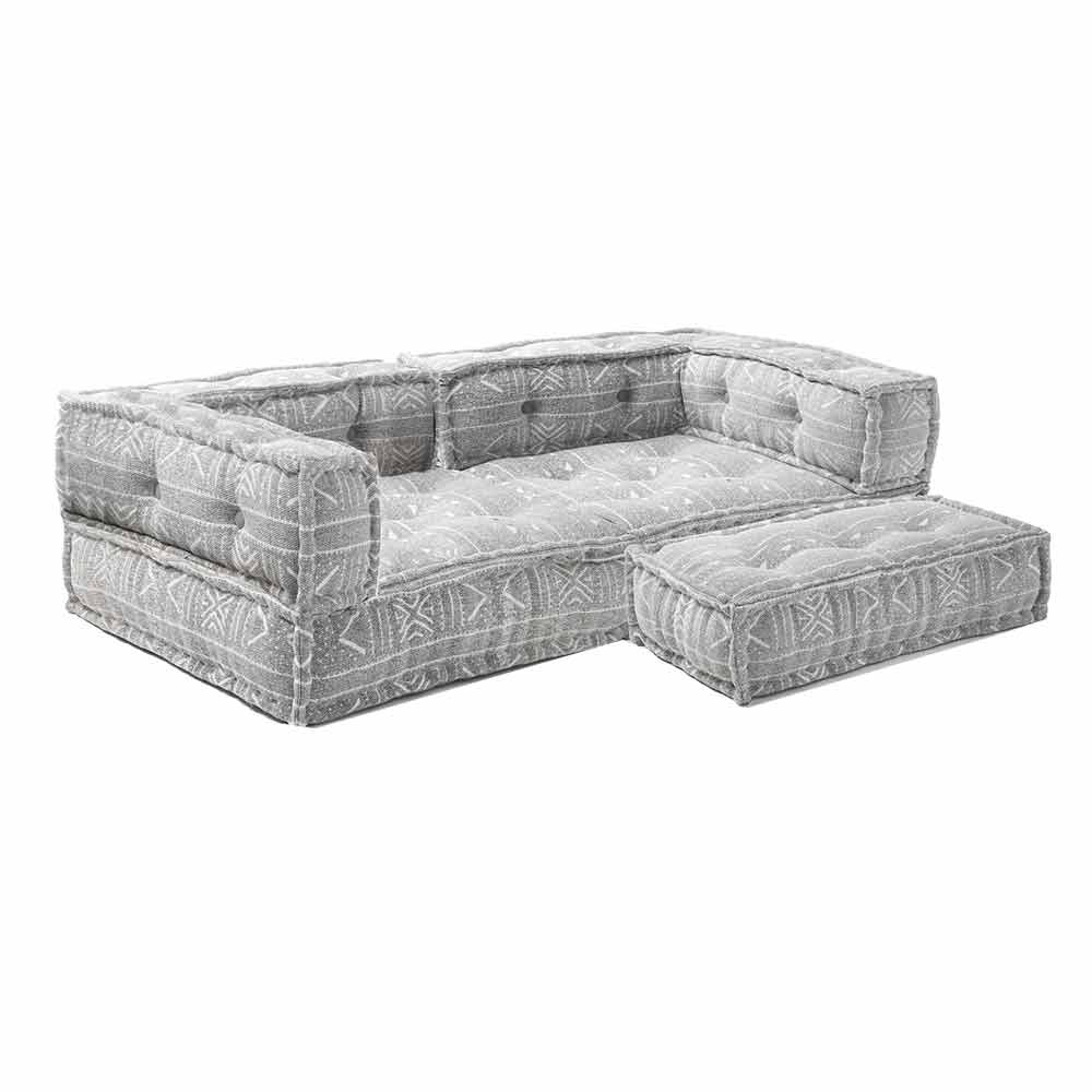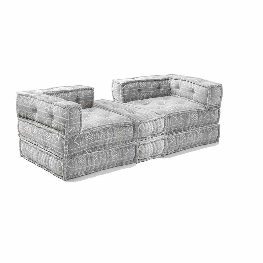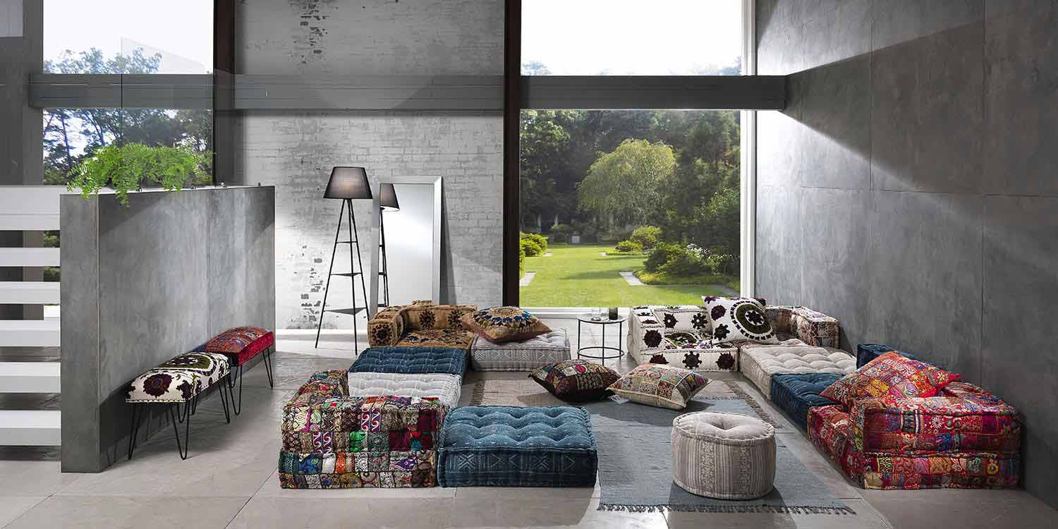 Dizajn etnik divan me dy vende në pëlhurë me ngjyra.