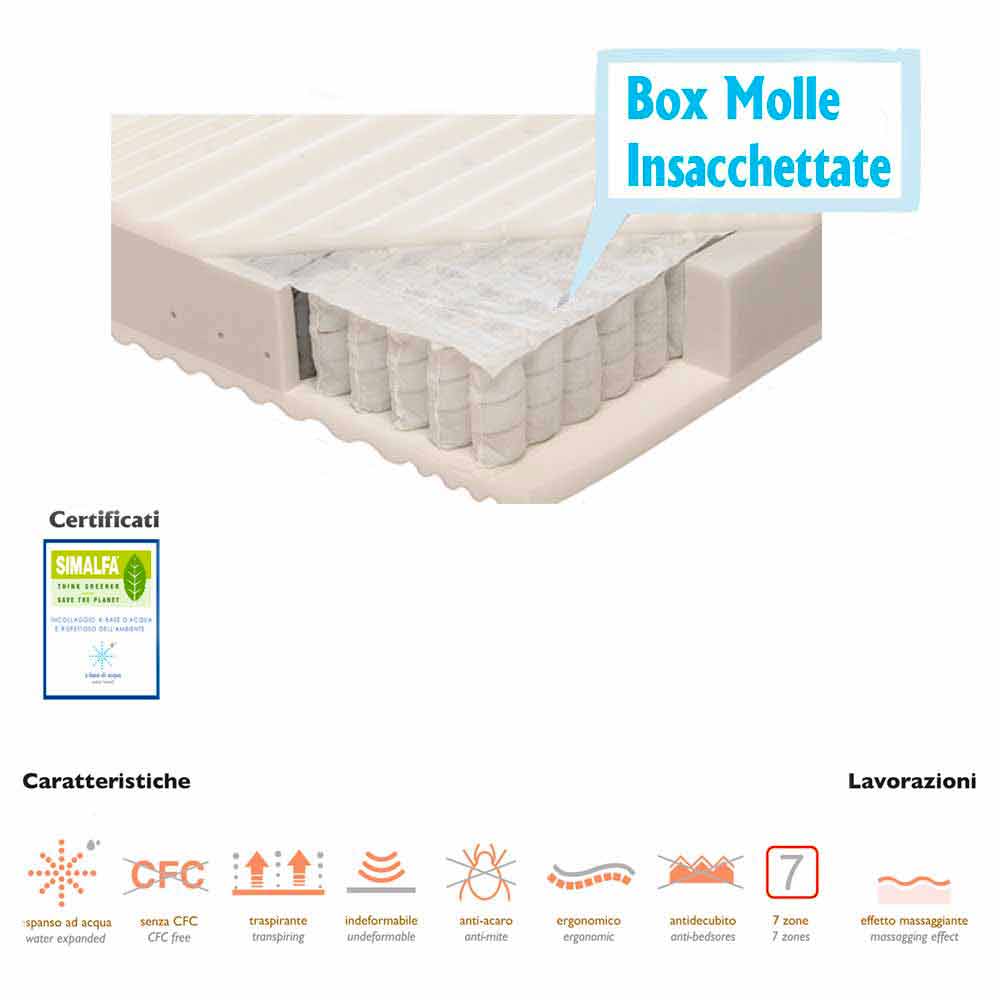 Dyshek Bio Spring. Dyshek me susta xhepi, secili i mbyllur në një çantë pambuku, të cilët veprojnë në mënyrë të pavarur nga njëri-tjetri, duke ngushëlluar butësisht trupin tuaj, duke iu përshtatur në heshtje çdo lëvizjeje dhe duke vepruar në mënyrë të pavarur nga çdo presion i marrë pa nxitur të tjerët. Sustat janë prej teli çeliku të ngurtësuar dhe janë me trashësi të ndryshme. Ato janë krijuar për të ofruar një efekt anatomik dhe për këtë arsye për t'u përshtatur më mirë me presionet e ndryshme që marrin, në këtë mënyrë trupi ndihmohet të pushojë në çdo pikë me mbështetjen e duhur. Struktura mbajtëse e dyshekut me susta xhepi ka karakteristika të shkëlqyera dhe e bën dyshekun ortopedik, por në të njëjtën kohë anatomik me përfitime të shkëlqyera për shtyllën kurrizore dhe qarkullimin. Karakteristikat Kuti e brendshme h14 cm me 400 susta për versionin tek, versioni dyfish 800 susta. Anëtarët anësore mbyllëse h14 cm në shkumë (poliuretani i ngurtë D25 kg/m3), shtresa e sipërme 3 cm, shtresa e poshtme 3 cm, e formuar në valë të diferencuara të shkumës (elastike D25 kg/m3 poliuretani i zgjeruar). Zgjerohet me ujë Pa CFC Frymëmarrëse I padeformueshëm Kundër marimangave Ergonomike Anti-dekubitus. Lartësia e pllakës së përfunduar: 22 cm, duke përfshirë veshjen. Pesha e mbështetur 50/100 kg. Mbulesa Paris në pëlhurë polikoton 200 g/m2 me zinxhir që ajroset është plotësisht e heqshme dhe e larë.