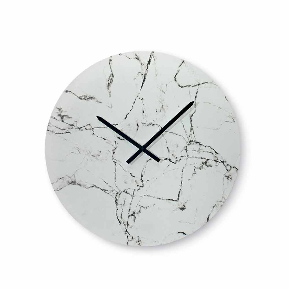 Orë muri e rrumbullakët e prodhuar në Itali e bërë nga xhamime efekt mermeri të bardhë me futje të zeza. Eleganca dhe thjeshtësia janë elementët themelorë që e dallojnë këtë pjesë të mobiljeve dhe e bëjnë atë unike dhe me klas. Përdorimi i përfundimit me efekt mermeri ndihmon në krijimin e një objekti të vërtetë dizajni, i cili përveç një funksioni thjesht praktik, mbi të gjitha luan një rol themelor dekorativ brenda dhomës. Kjo lejon që ora të mbushë mure të tëra të zhveshura edhe vetë, duke dhënë një prekje origjinaliteti dhe karakteri , si dhe një atmosferë më të rafinuar dhe mikpritëse.