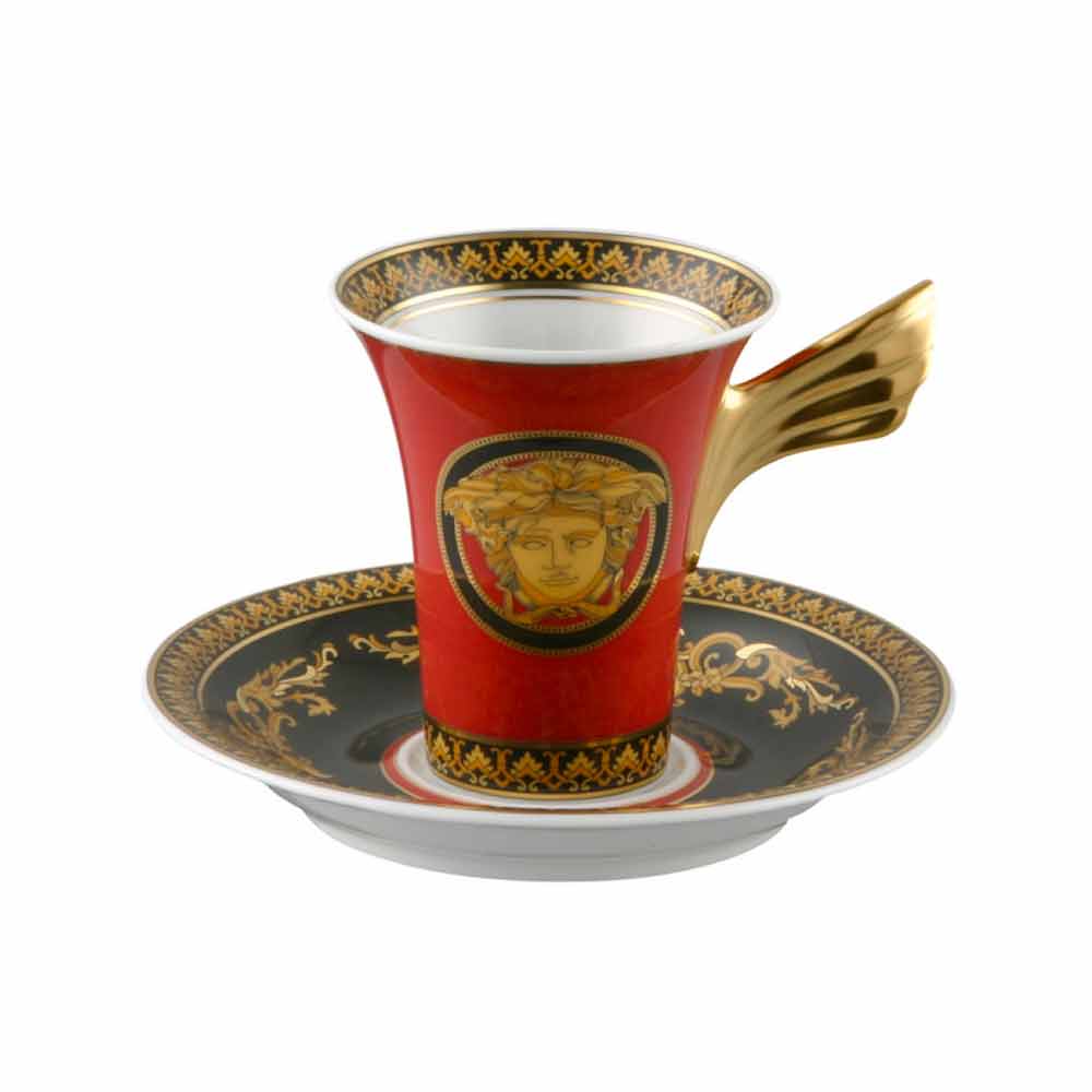 Porcelani për filxhan kafeje Rosenthal Versace Medusa Rosso Design Filxhani dhe disku i kafesë Versace janë pjesë e linjës Medusa Rosso e cila përbëhet nga dy ose tre nuanca: një e kuqe elegante dhe ari dhe e zeza më e çmuara; të cilat kur kombinohen formojnë një motiv të rafinuar që të çon në epoka magjepsëse dhe të largëta. Koka e Medusës është ikona e koleksionit Versace që e bën këtë një shërbim klasik por në të njëjtën kohë një simbol luksi në tryezën bashkëkohore. NB. Mos lani në makinë larëse enësh, ju lutemi lani me dorë!