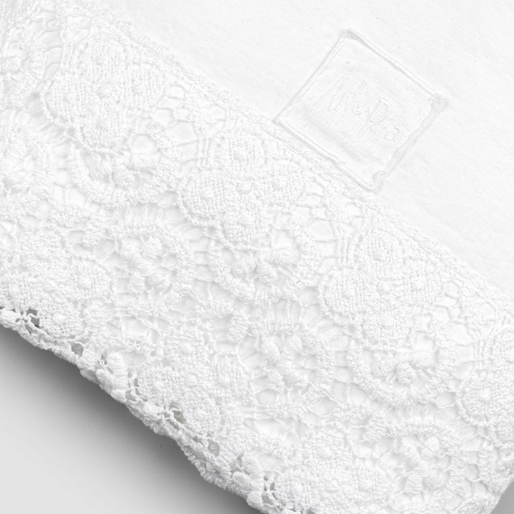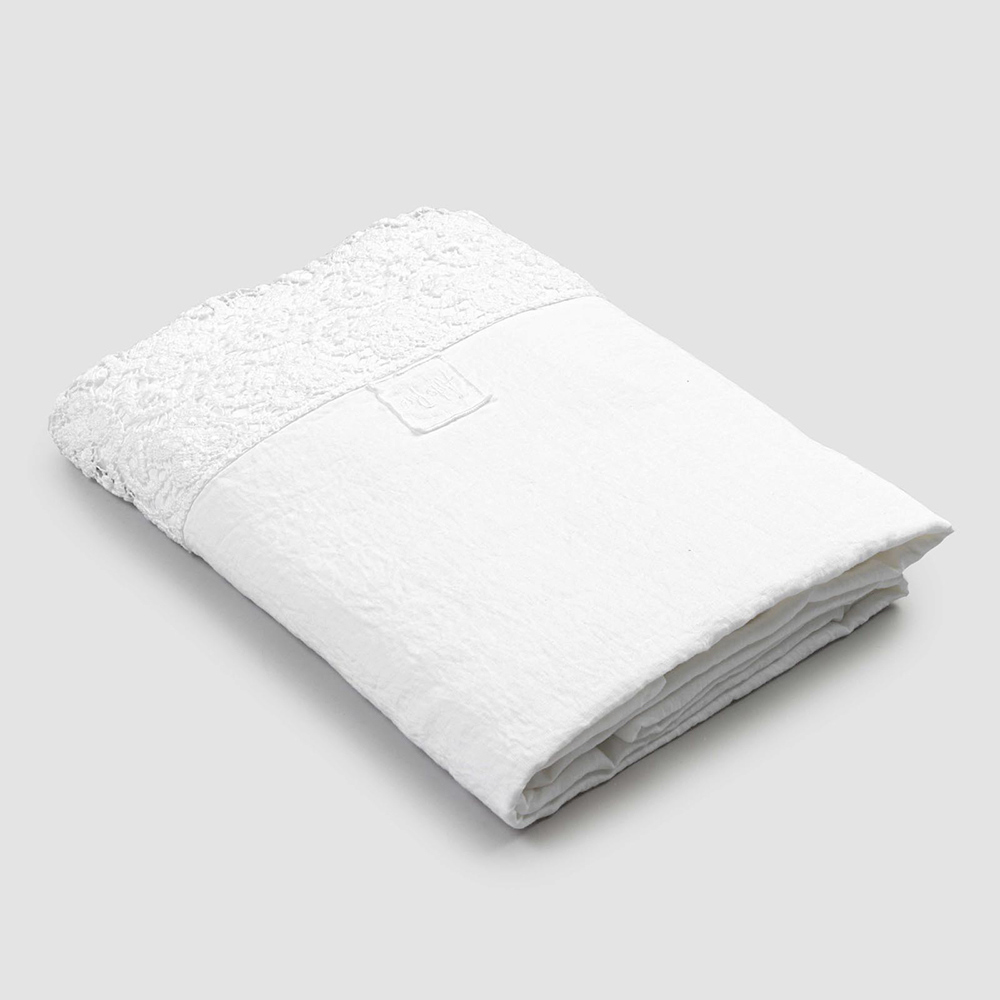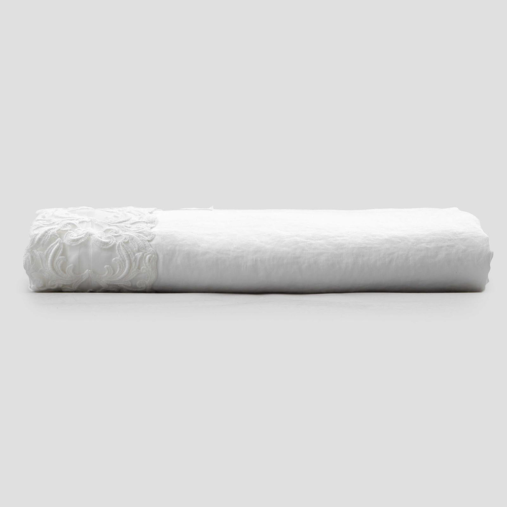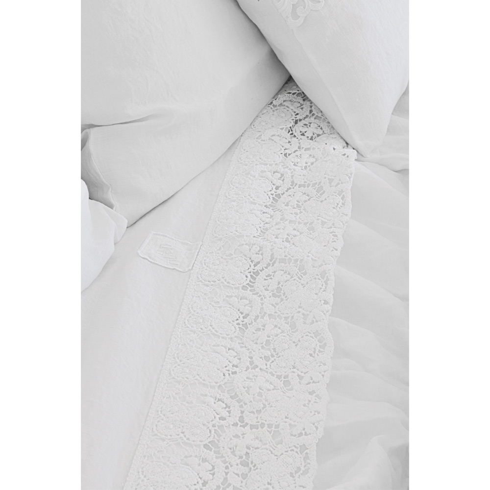 Fletë për krevat dopio në liri të bardhë të pastër me lloje të ndryshme të dantellave, zejtari me dizajn luksoz prodhuar në Itali.