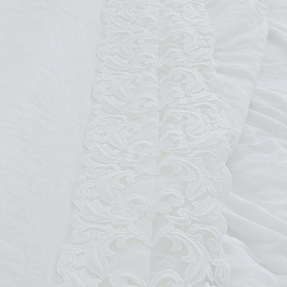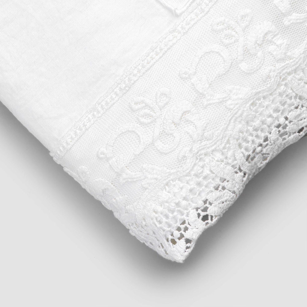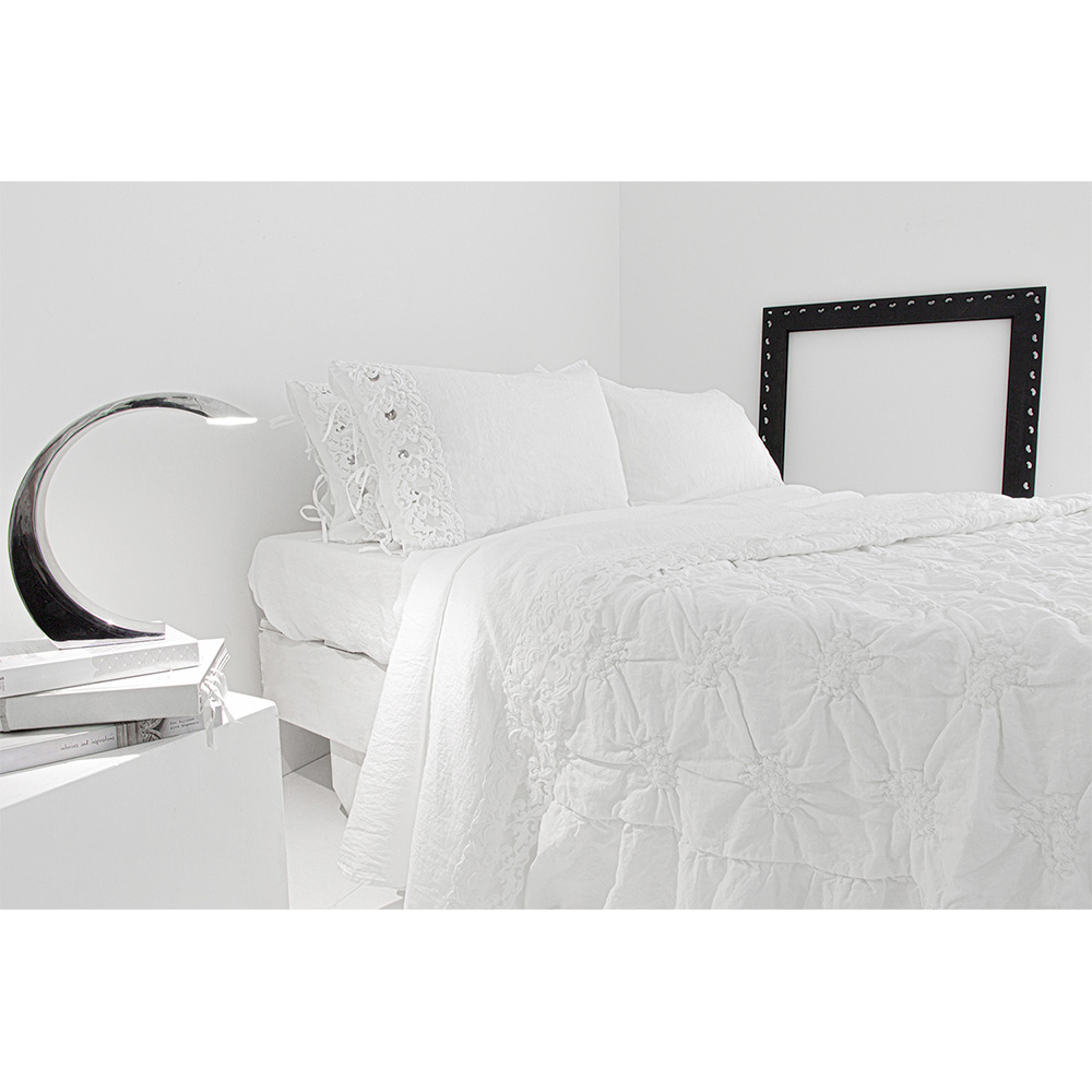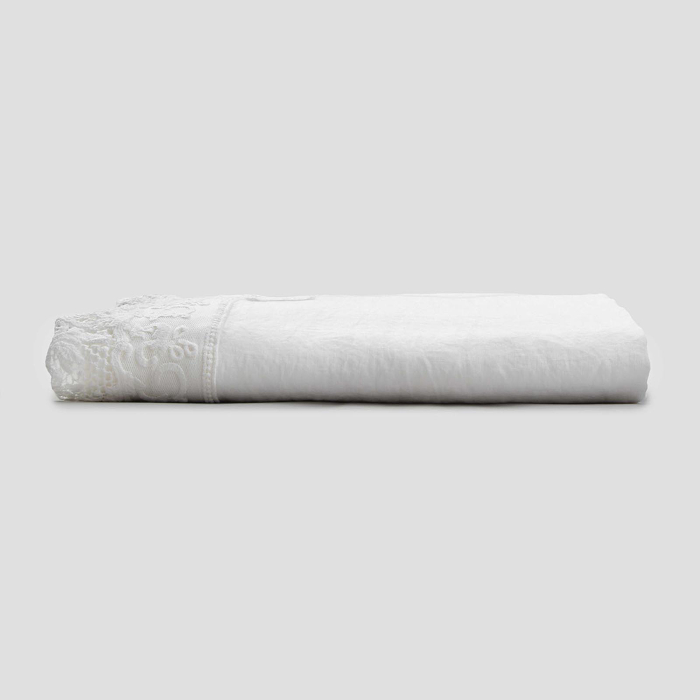Fletë për krevat dopio në liri të bardhë të pastër me lloje të ndryshme të dantellave, zejtari me dizajn luksoz prodhuar në Itali.