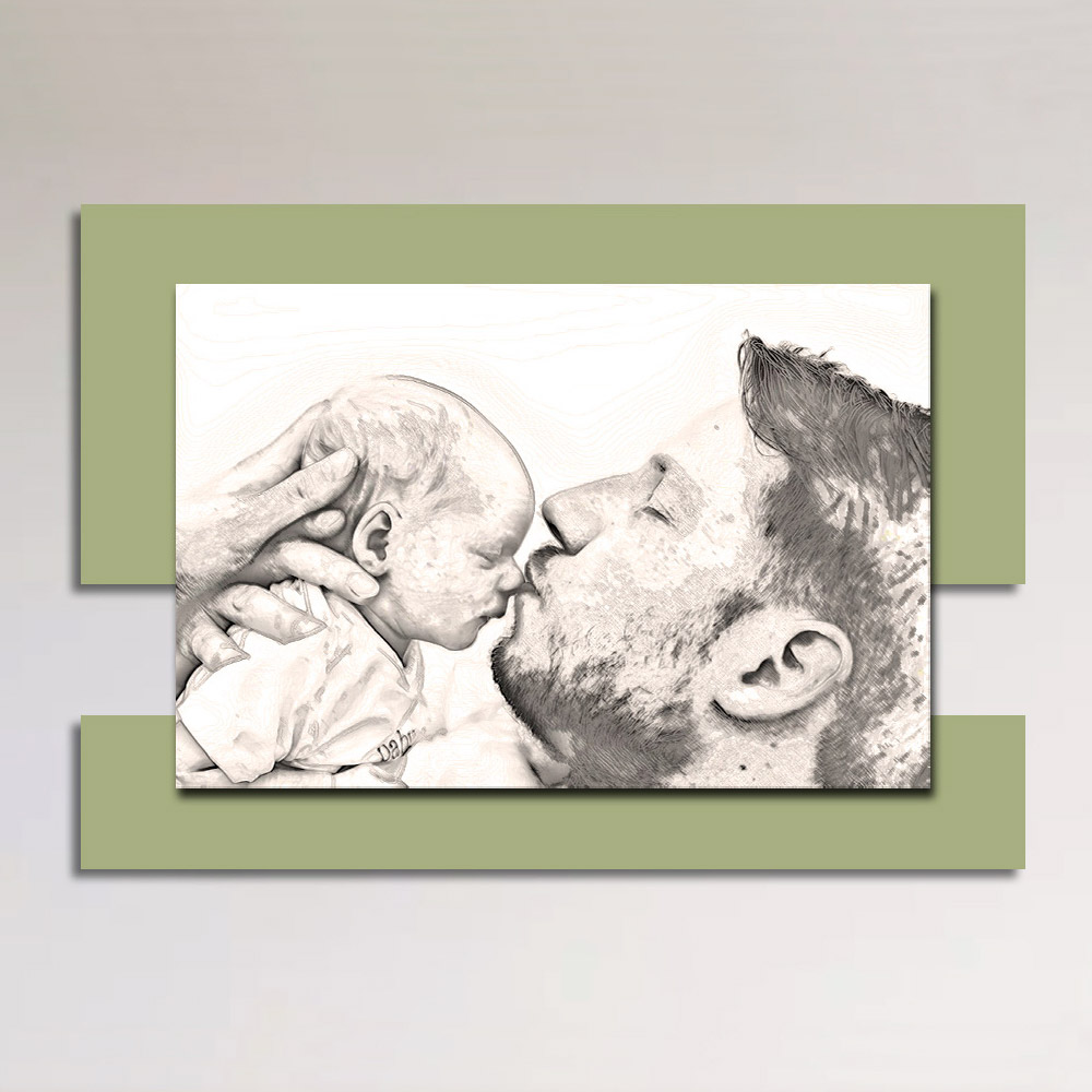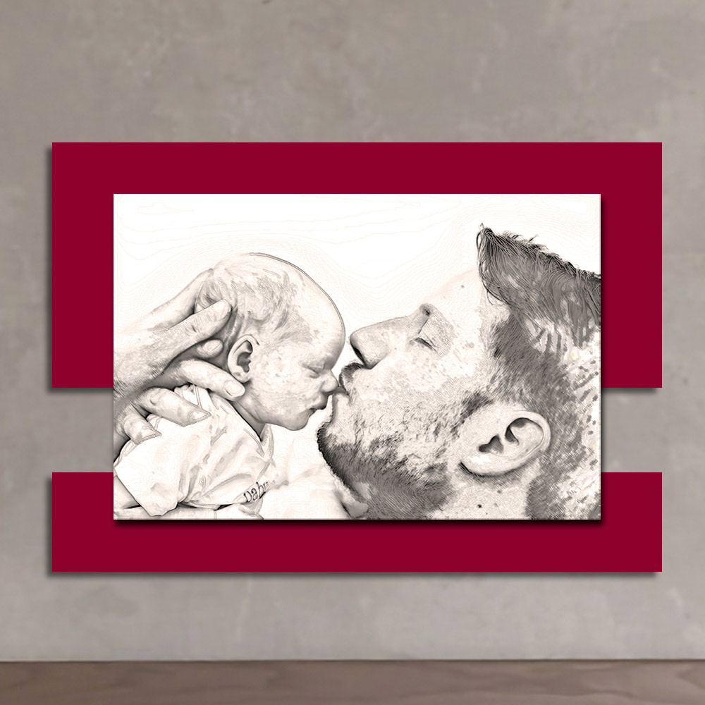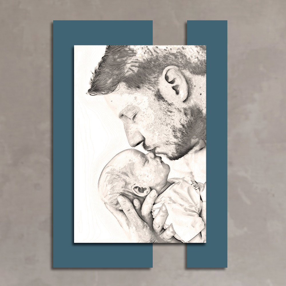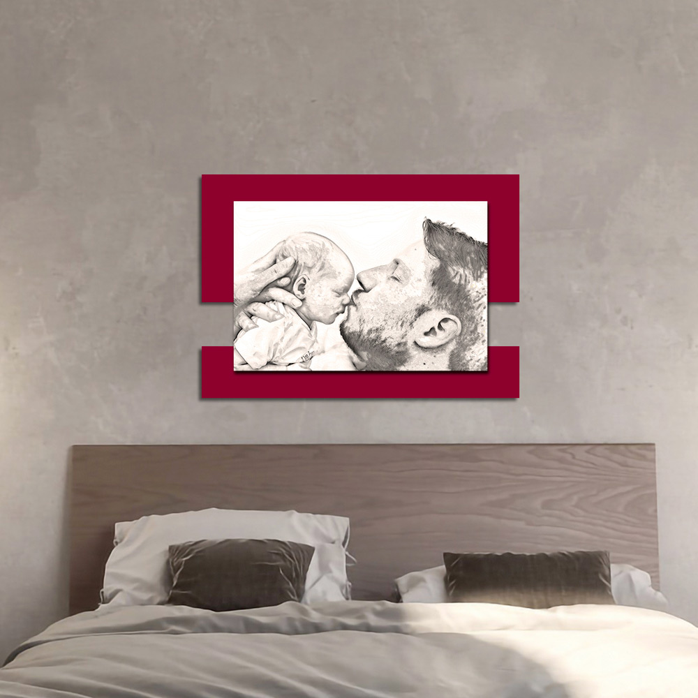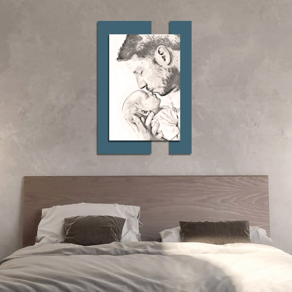Paneli i bërë tërësisht prej druri me një printim të një burri që puth një fëmijë. Tufa për t'u varur si horizontalisht ashtu edhe vertikalisht. Mbrojtja dhe dashuria e babait ndaj të birit përcillet me intensitet nga kjo pikturë, në puthjen në hundë dhe nga mënyra sesi babai i mban duart të shtrënguara pas kokës së fëmijës. Finiturat, druri i zgjedhur për prodhimin dhe teknika e printimit nxjerrin në pah të gjithë cilësinë e një elementi të prodhuar në Itali, i cili i jep vetes kompletimin në mënyrë perfekte të arredimit të çdo ambienti, duke i dhënë atij një atmosferë të ngrohtë dhe mikpritëse.